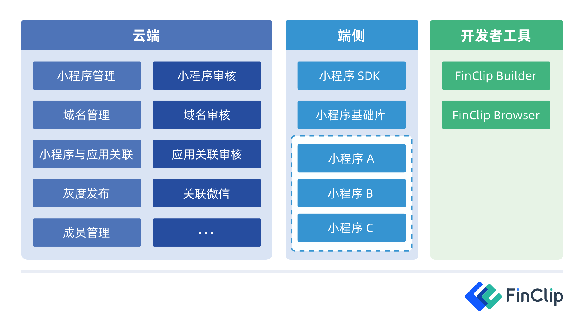所组成,云侧代表 FinClip 小程序管理后台,用于对小程序的开发上架等全生命周期进行管理;端侧则代表集成了 FinClip 小程序 SDK 的移动 App 或各类智能设备,用于向其提供能够运行小程序的能力;开发者工具则主要用于编写,调试,上传,预览小程序代码。