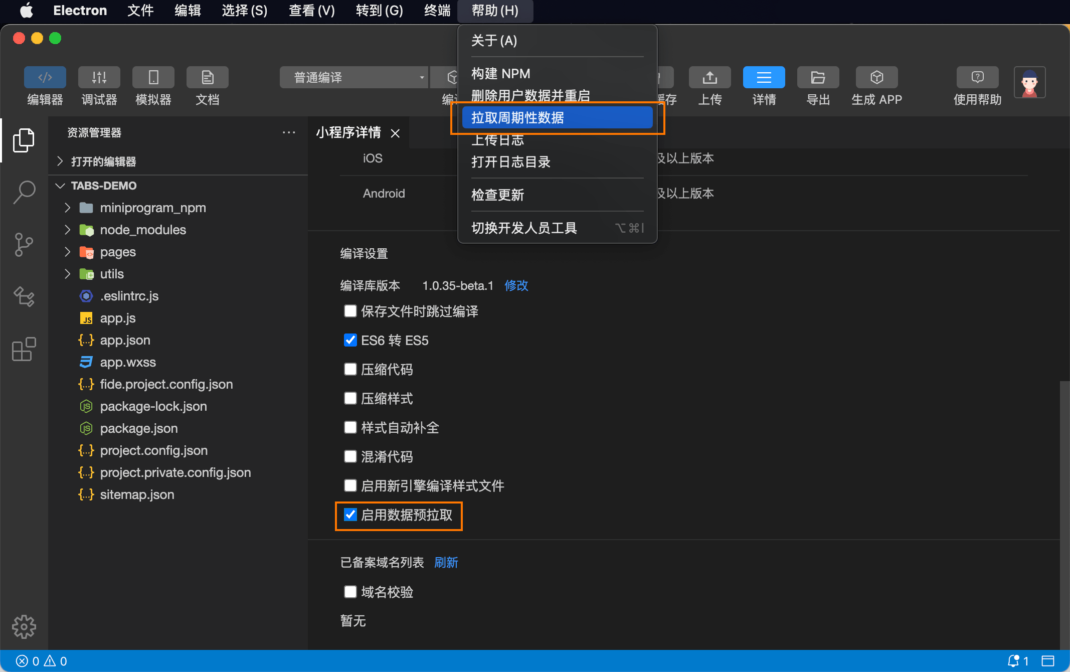 1、小程序详情中会有【数据预拉取】的勾选项,勾上后重新编译小程序时会触发【数据预拉取】的请求
