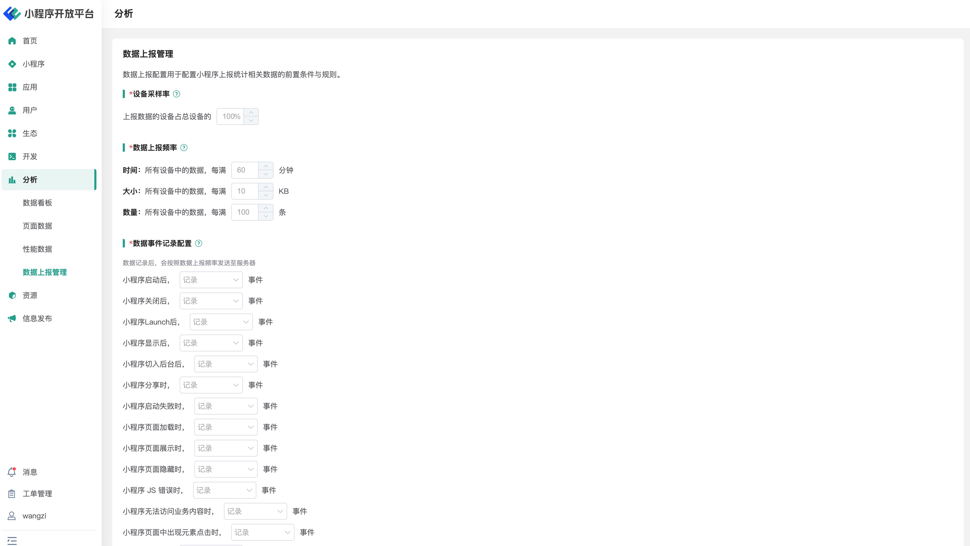 在数据上报管理页中,管理员可以配置小程序上报统计相关数据的前置条件与规则,如数据上报频率、数据大小、数量信息。此外还可以根据实际需要,分别配置不同事件的默认上报状态。