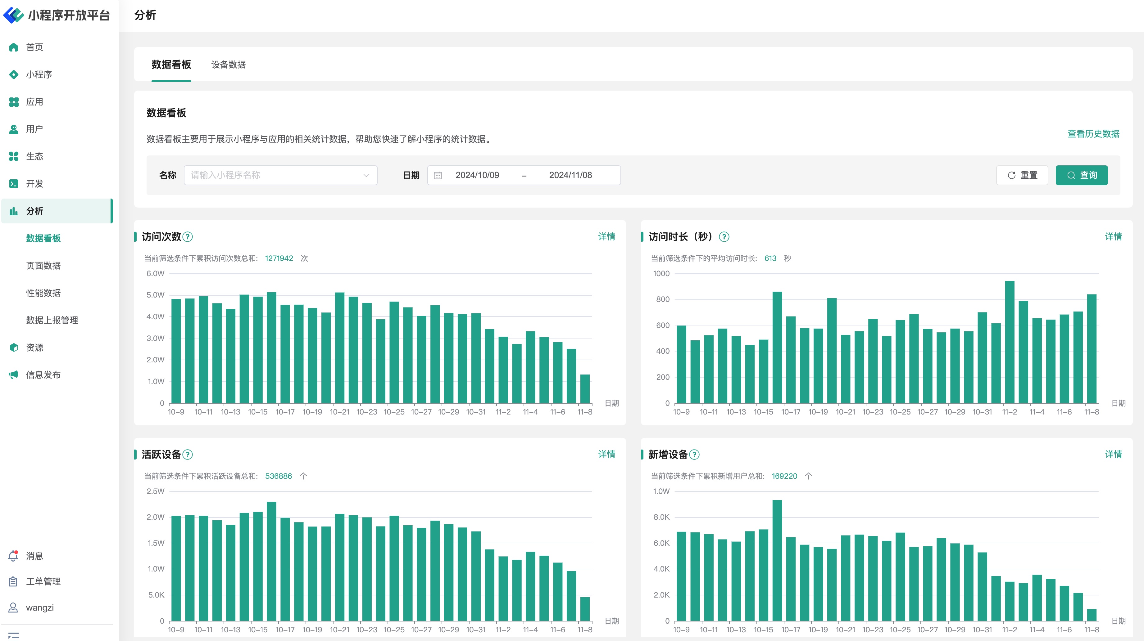 数据看板模块为用户提供了一个集中展示关键性能指标(KPIs)的界面。页面中可看到所有小程序汇总或按照小程序与时间筛选的核心数据。