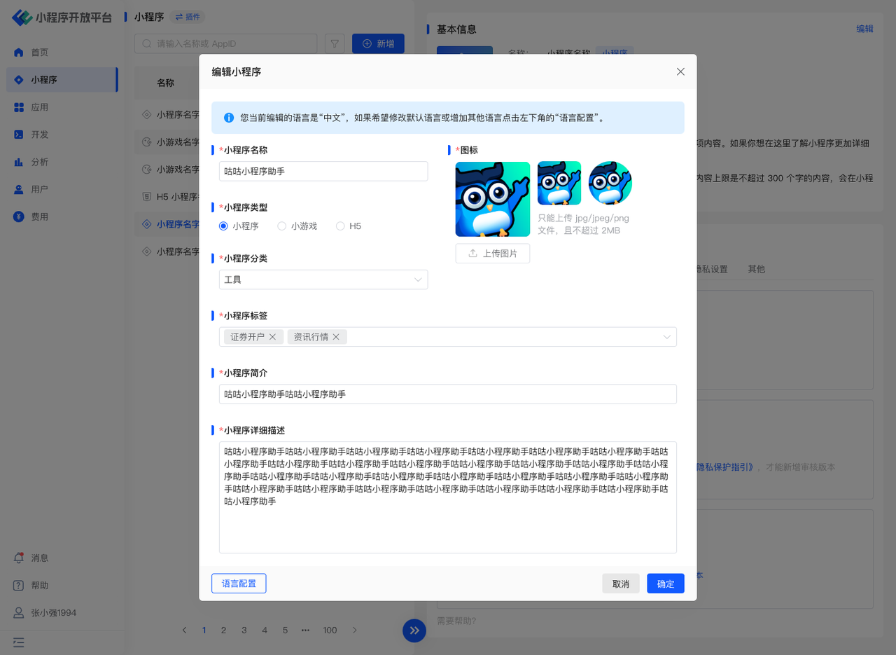 基本信息包括小程序名称、小程序类型、分类、简介和详细描述,点击左下角的「语言配置」则可进入多语言配置页面。