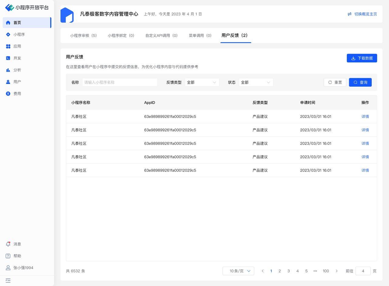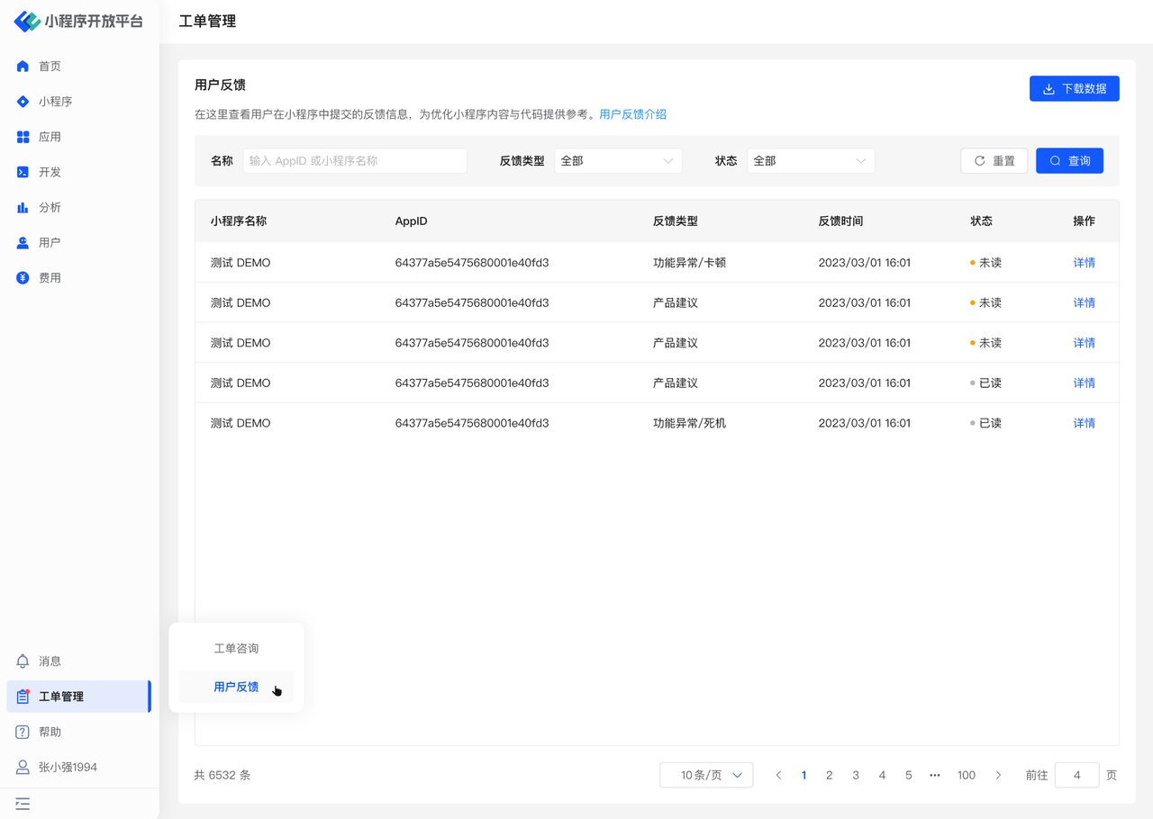 其中「功能异常」和「产品建议」的反馈会收集至开发中心的首页-待办中心,请及时处理。