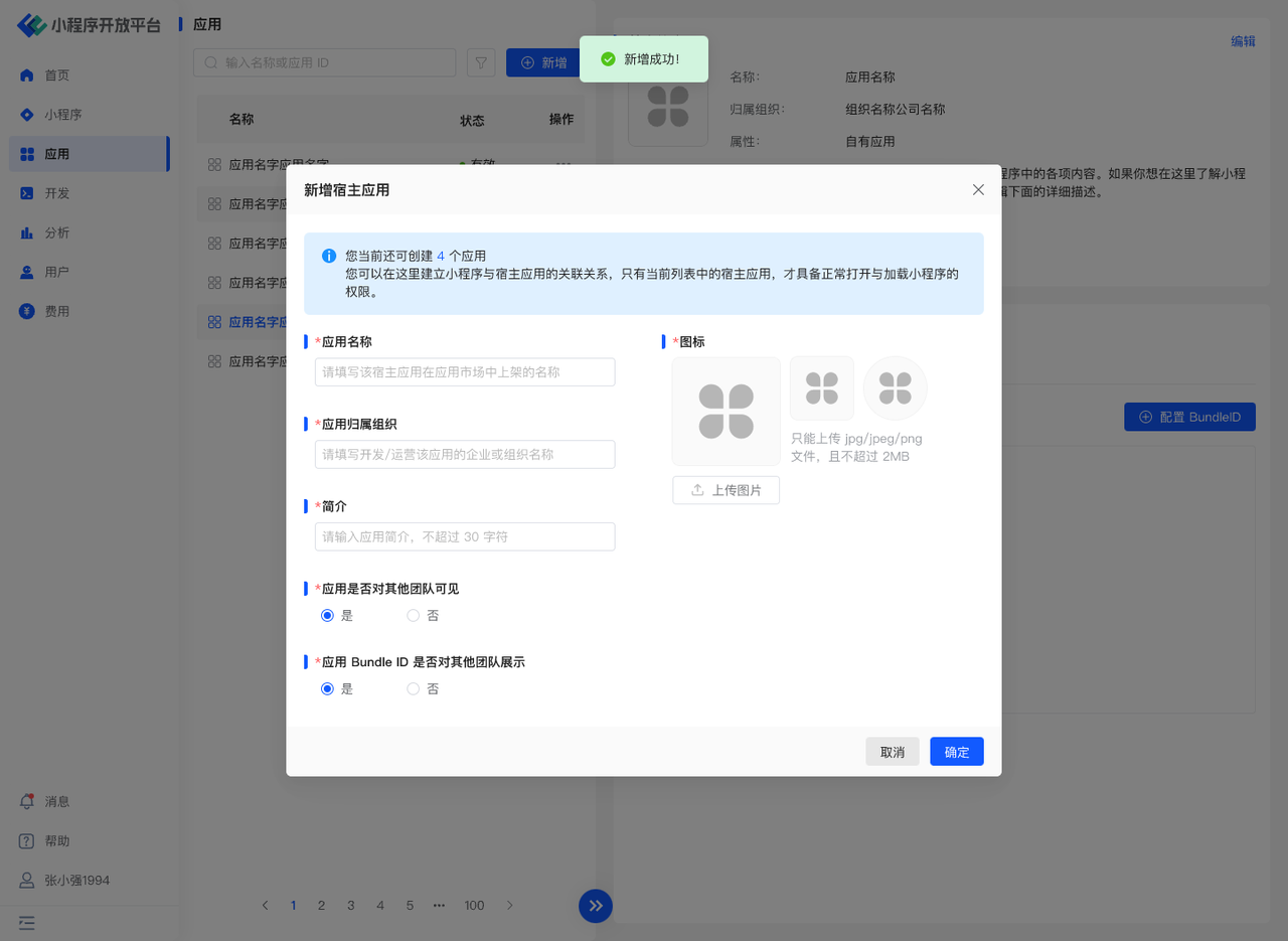 新增应用时,需填写应用名称与应用所属企业名称,上传图标,并确定是否对其他团队可见、BundleID 是否对其他团队可见。其中: