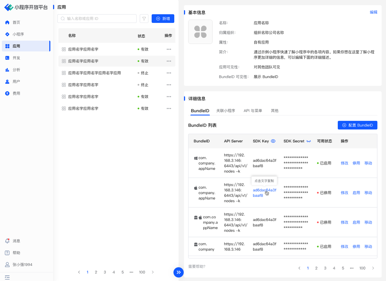 因此您需要在对应 BundleID 的右侧复制对应的 Key 及 Secret,并按照 SDK 配置文档将其填入 SDK 初始化的字段中。