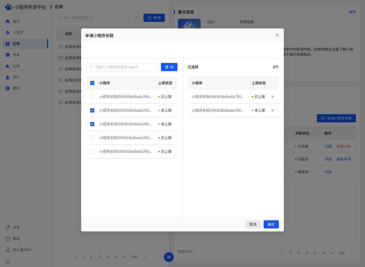 在弹窗中选择小程序进行关联,如下图。选择小程序后,第三方应用还需在自己的 APP 中增加小程序入口,以使用户可进行正常访问;