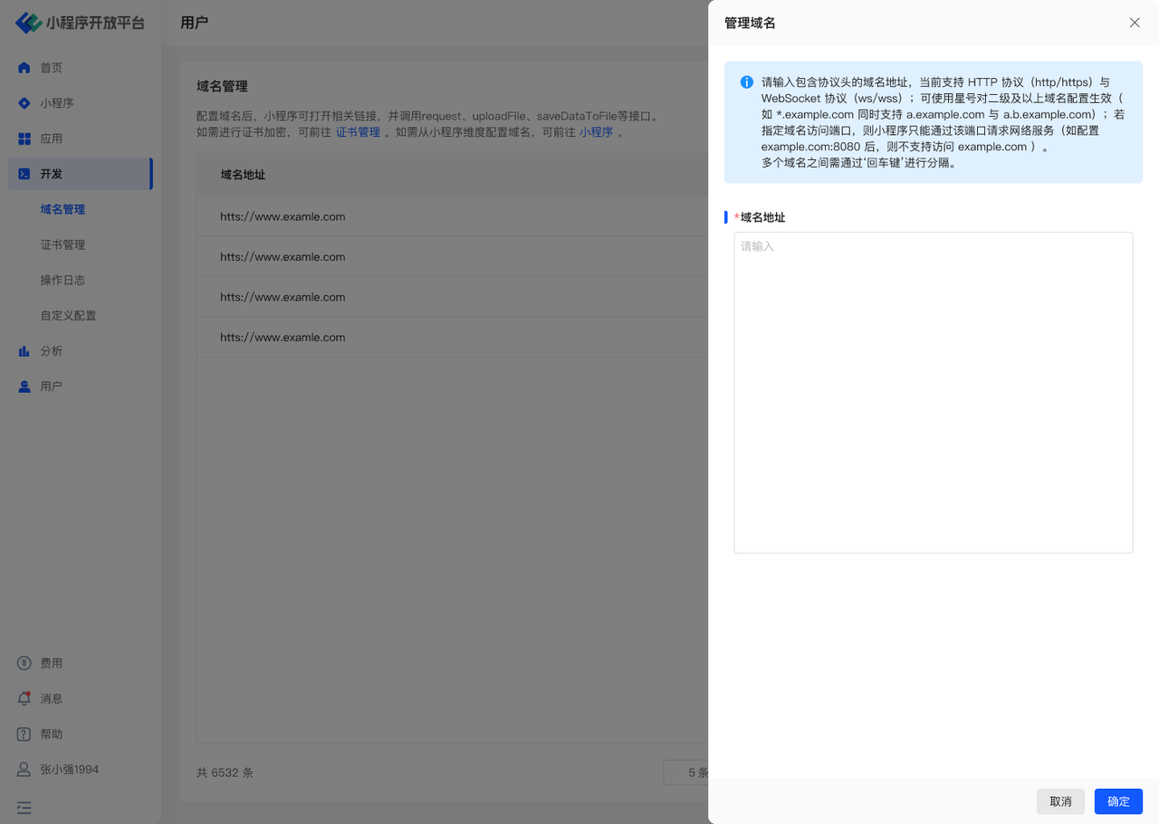 在「开发 - 域名管理」页面中可以管理当前团队所有可使用的小程序域名(即一次配置后所有小程序同时生效),在域名配置处录入当前团队使用的所有域名地址,并使用“回车换行”进行区分后保存即可。