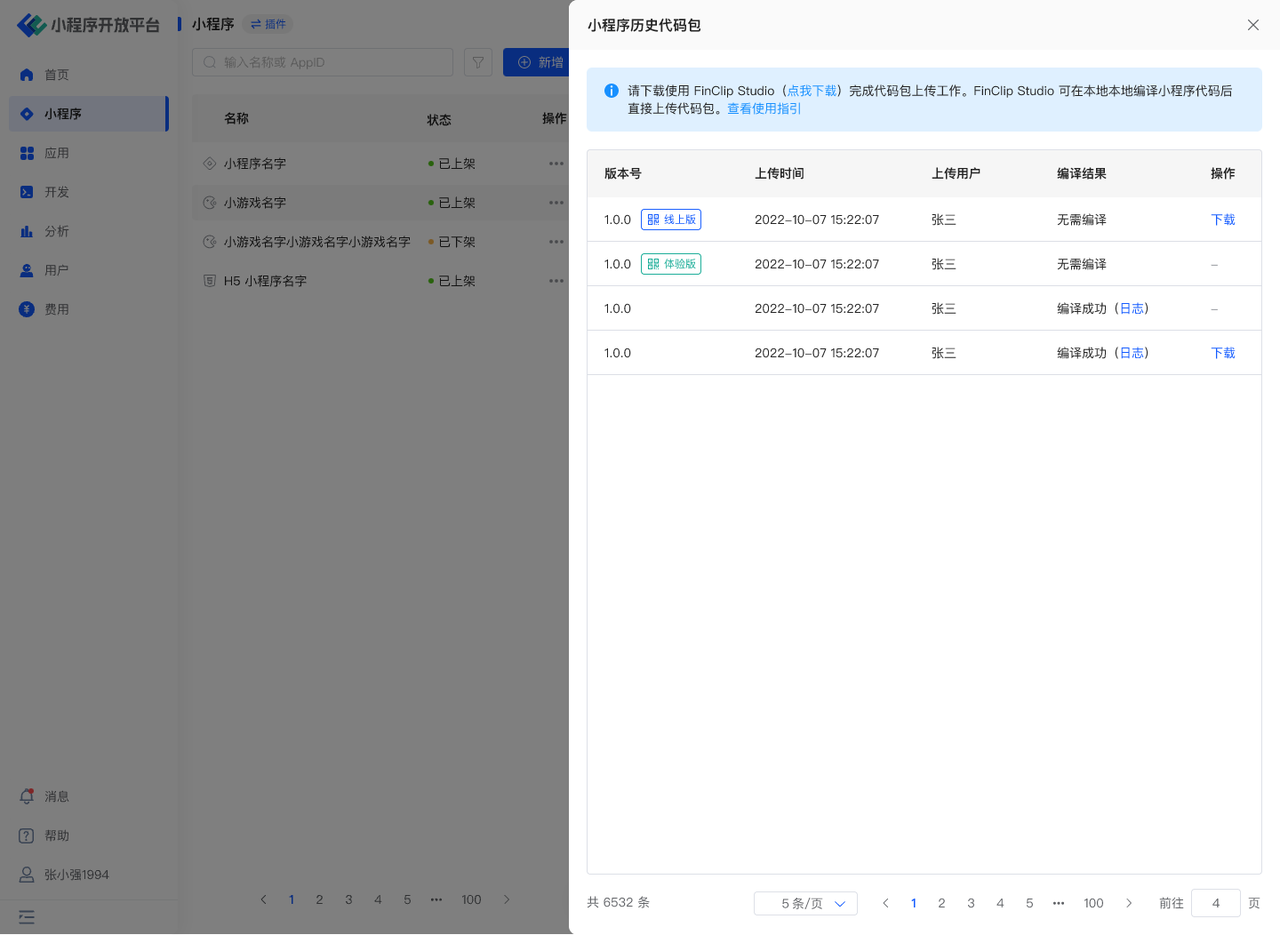 请下载 FinClip Studio 完成代码包上传工作。FinClip Studio 可在本地本地编译小程序代码后直接上传代码包。详细操作指引请参考:开发者工具操作指引 (opens new window)