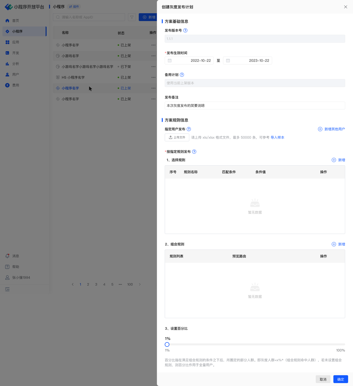 创建灰度发布计划,可按指定规则发布,如下图;如需配置更多规则,可前往「开发-灰度规则」进行设置。