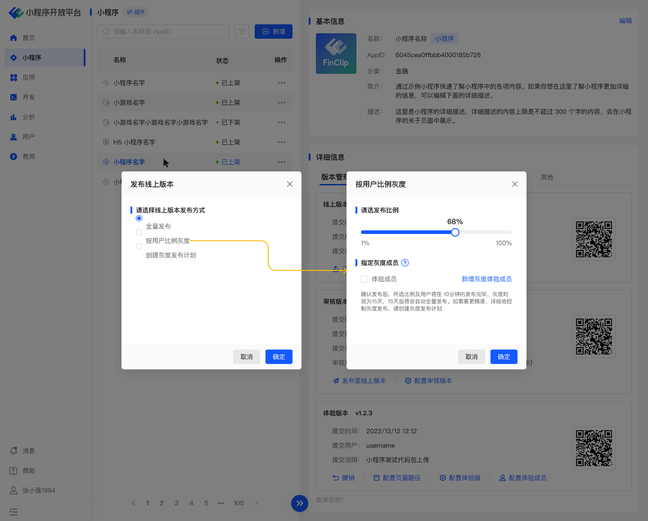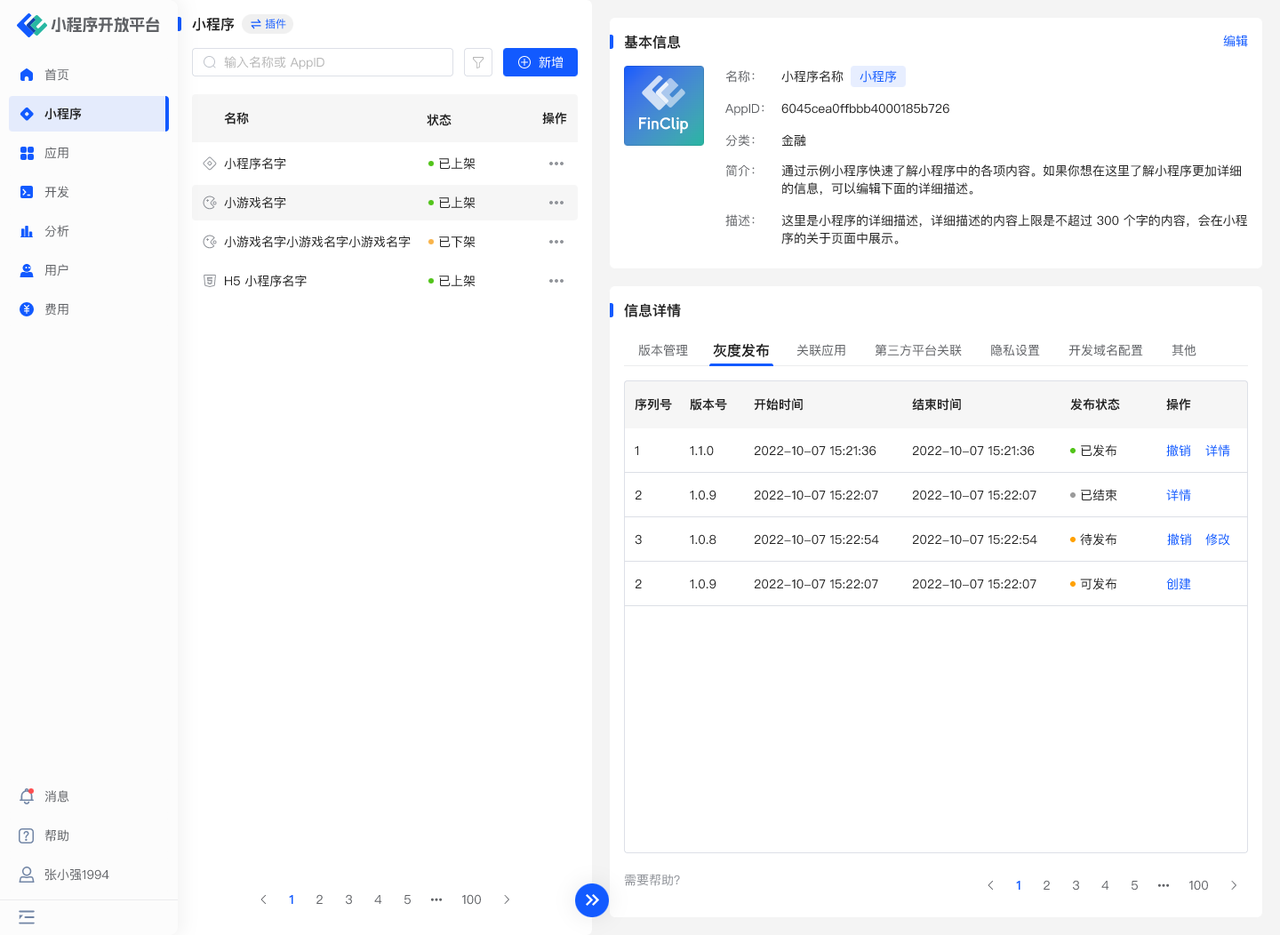此外,可在「小程序-详情-灰度发布」中查看所有可发布/发布中/待发布/已结束状态的小程序版本,针对「可发布」状态的版本,同样可以点击「创建」以进行详细的灰度发布;
