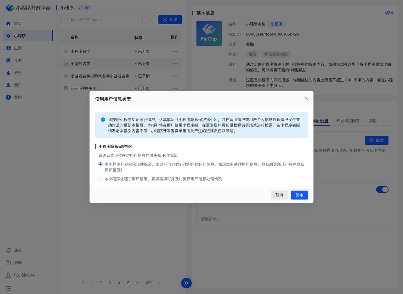 点击「配置」,须按照页面引导补充对应的小程序隐私信息接口。