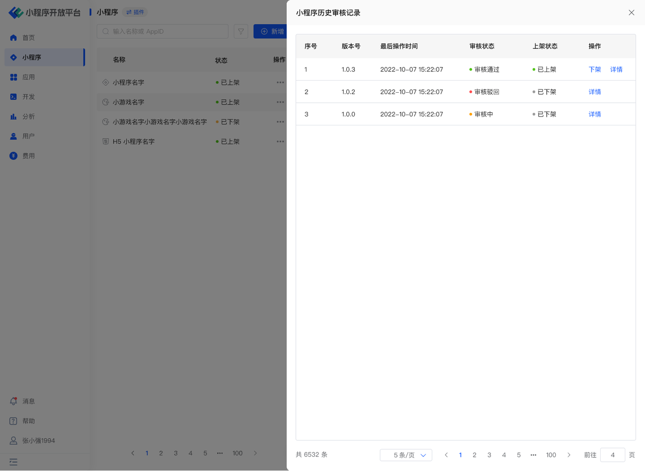 在「小程序-详情-其他-小程序历史审核记录」中,可查看所当前小程序的版本审核记录