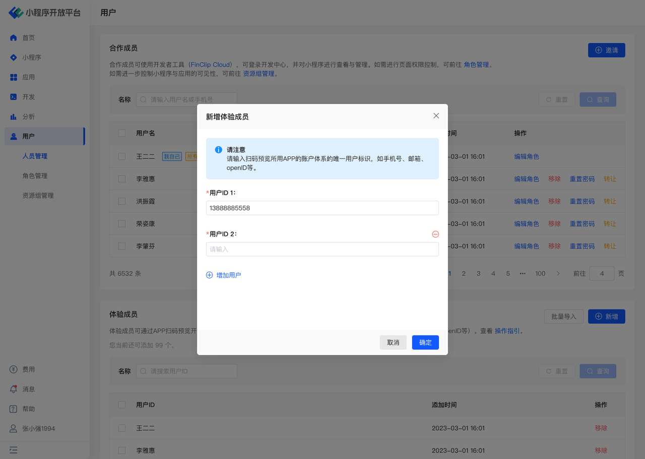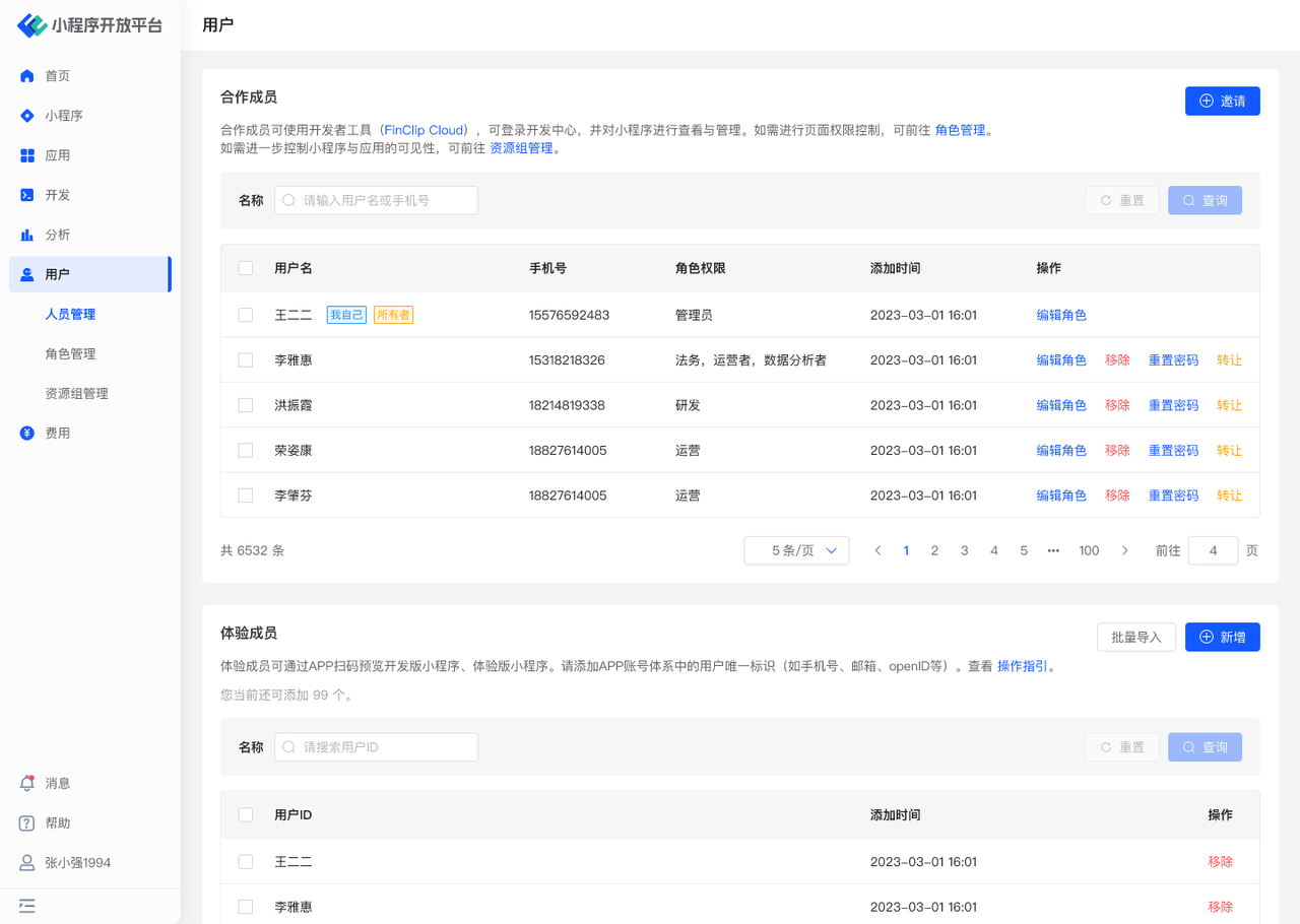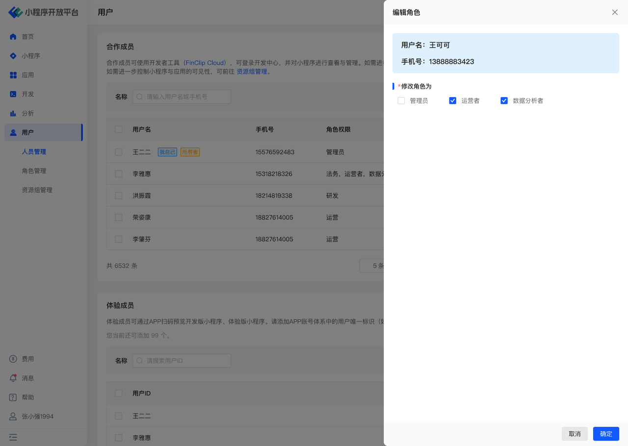 - 体验成员:指代能够通过 APP 扫码预览本组织的开发版小程序、体验版小程序的人员。无需额外配置角色。