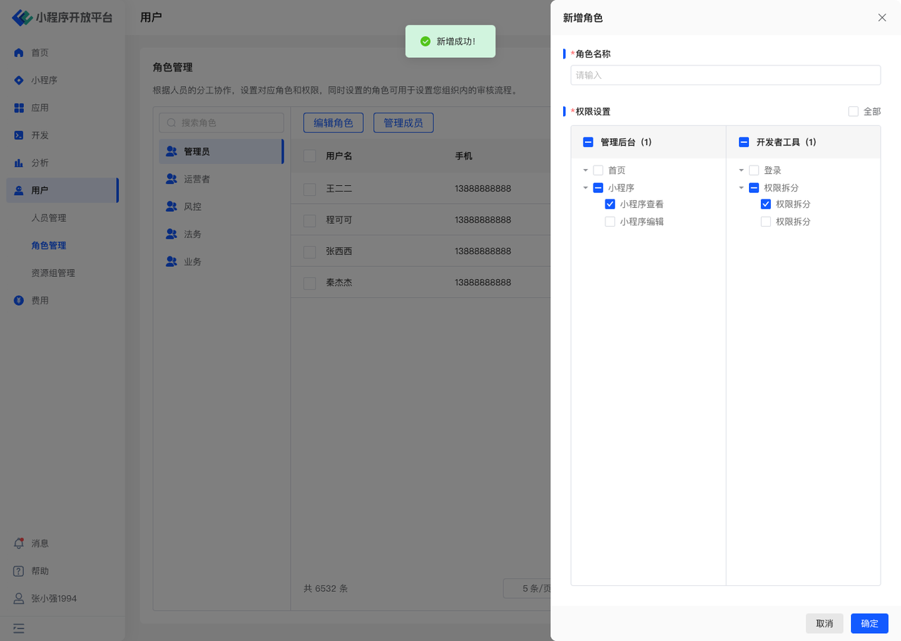 在「新增角色」抽屉中输入角色的名称,并勾选相对应的管理后台和开发者工具权限,点击「确定」保存