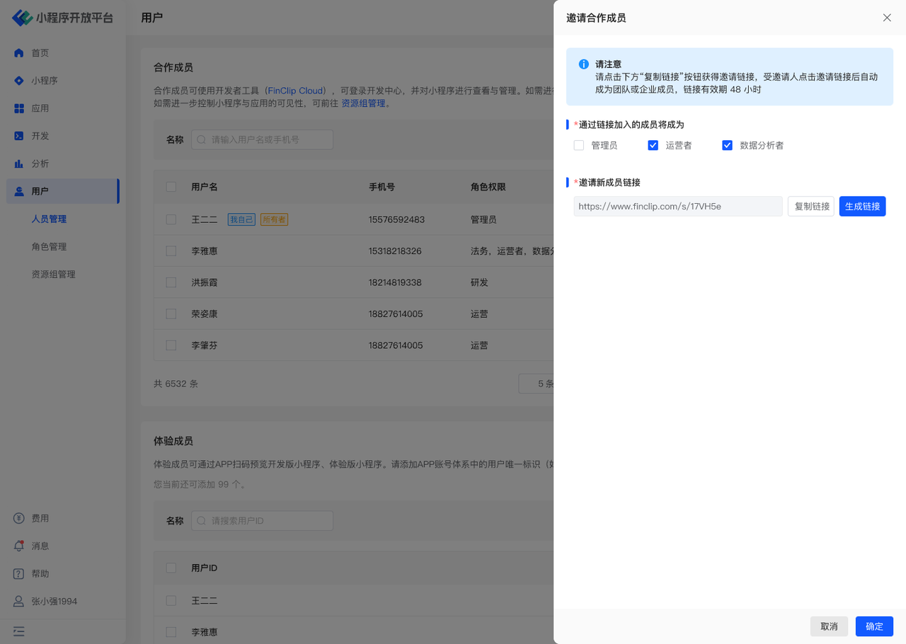 合作成员为「邀请制」,用户通过邀请链接方可加入本组织。在进行邀请时,需选定角色,用户成功加入后,管理者可再次编辑其角色。如用户没有小程序平台的账号,须先注册后方可加入新组织。