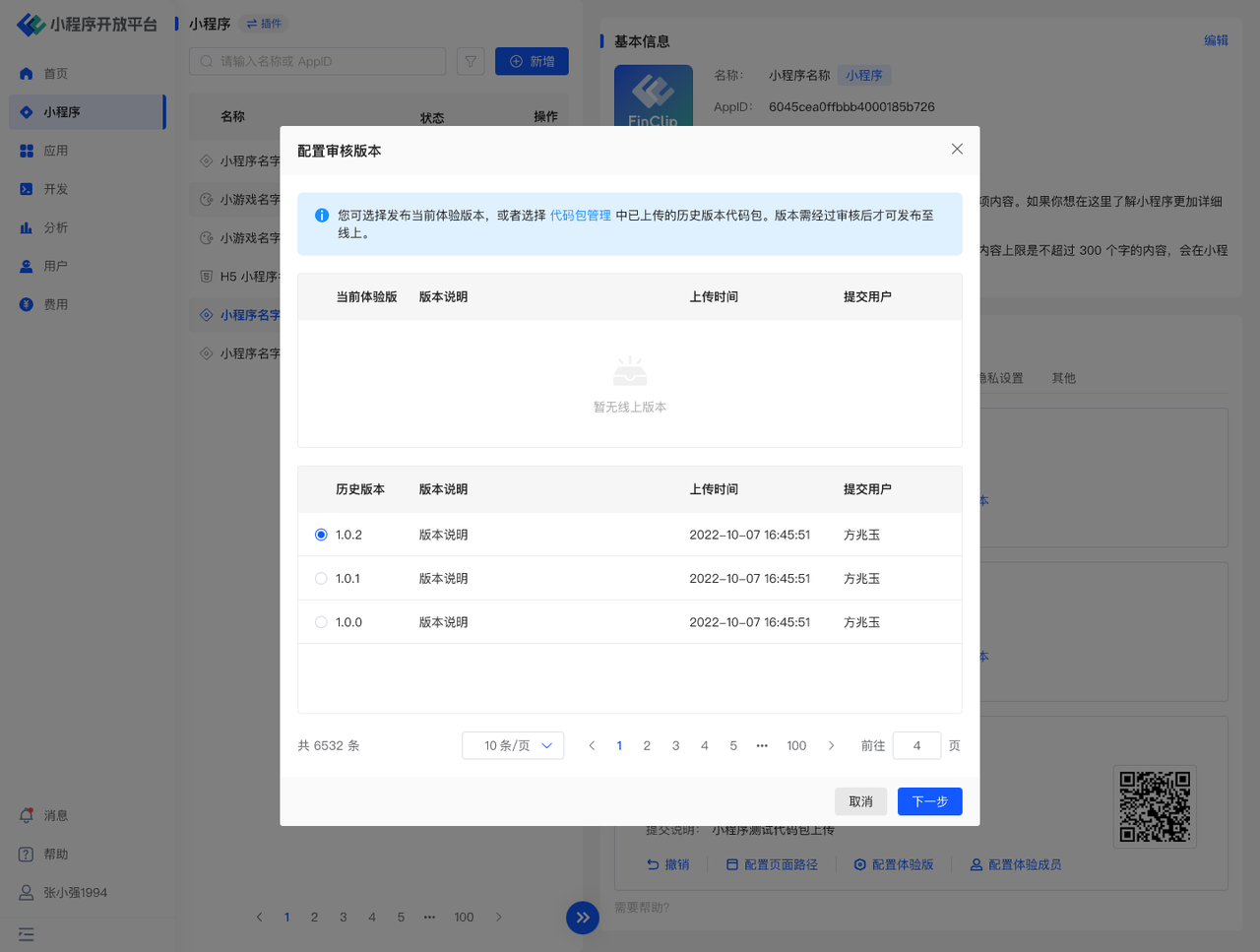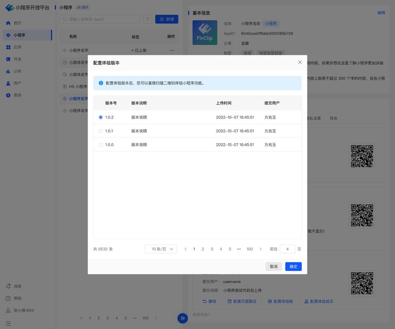 在代码包上传成功后,你可以在「小程序-小程序-详情-版本管理」页面中点击「配置体验版」,将对应版本小程序设置为体验版本。