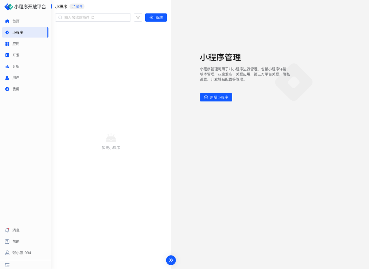 若您是首次登录 FinClip 小程序开放平台,可以分别从首页或小程序页面中点击「新增」按钮开始创建小程序。