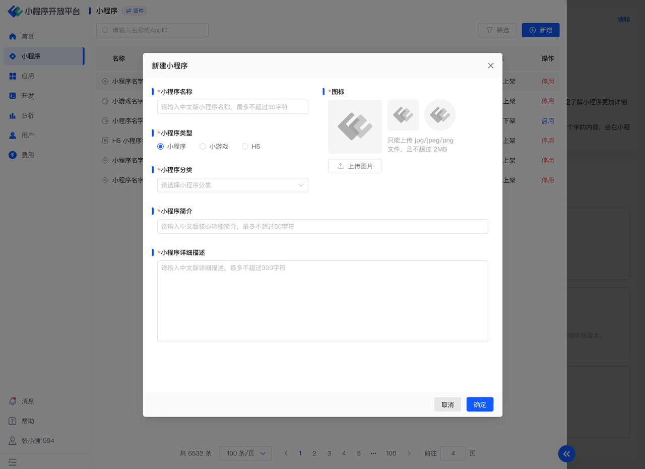 新建小程序时,需要分别配置小程序的名称,类型,分类,图标,简介以及详细描述信息。