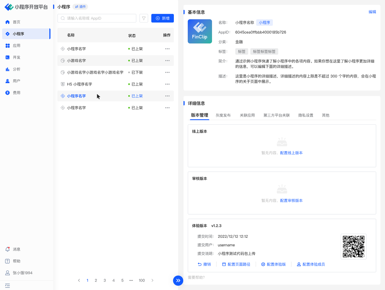 当小程序审核通过后,您就可以在“小程序详情 - 审核版本”处,将当前小程序发布为线上版本,在小程序上架后则可以与宿主应用进行关联操作。