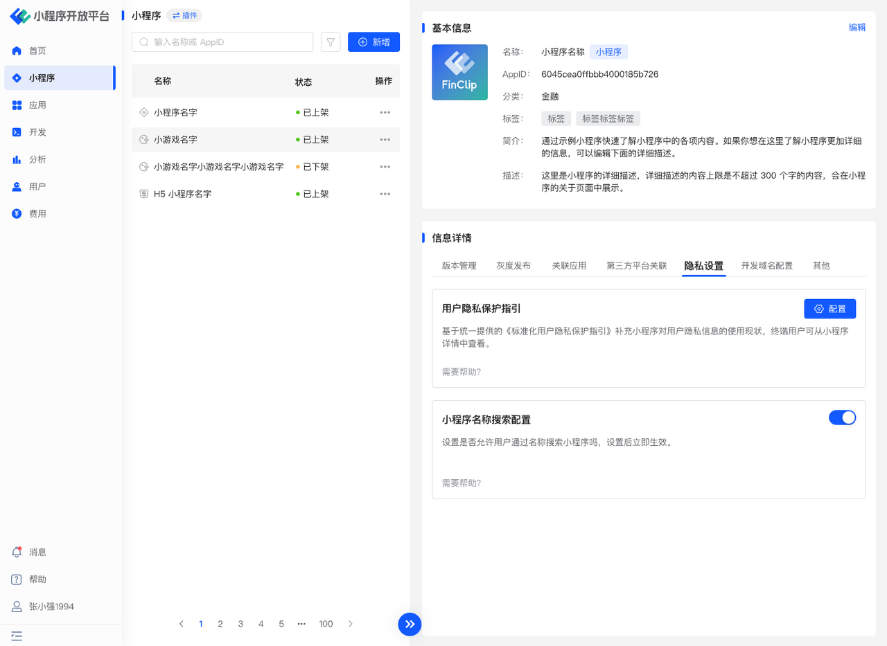 FinClip Cloud 小程序开放平台共分为“开发中心”与“数字中心”两端,开发中心用于帮助小程序或宿主应用开发者开发管理自己的小程序或 App 应用,数字中心则用于帮助小程序生态运营方对平台中所有小程序与宿主应用进行全局管理工作。