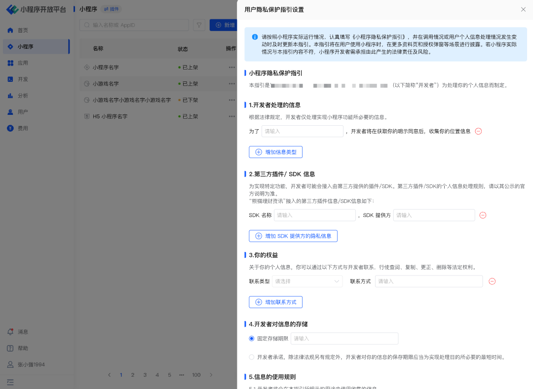小程序用户隐私保护指引设置中的相关字段包括“开发者如何处理信息,小程序中集成的第三方插件与 SDK 信息,小程序如何处理用户的个人信息”等相关字段,请您根据实际使用情况妥善填写。