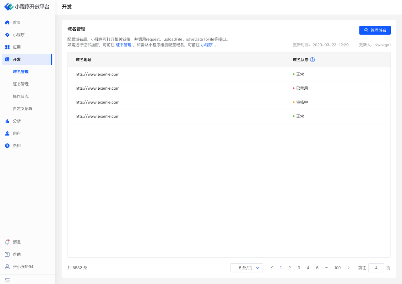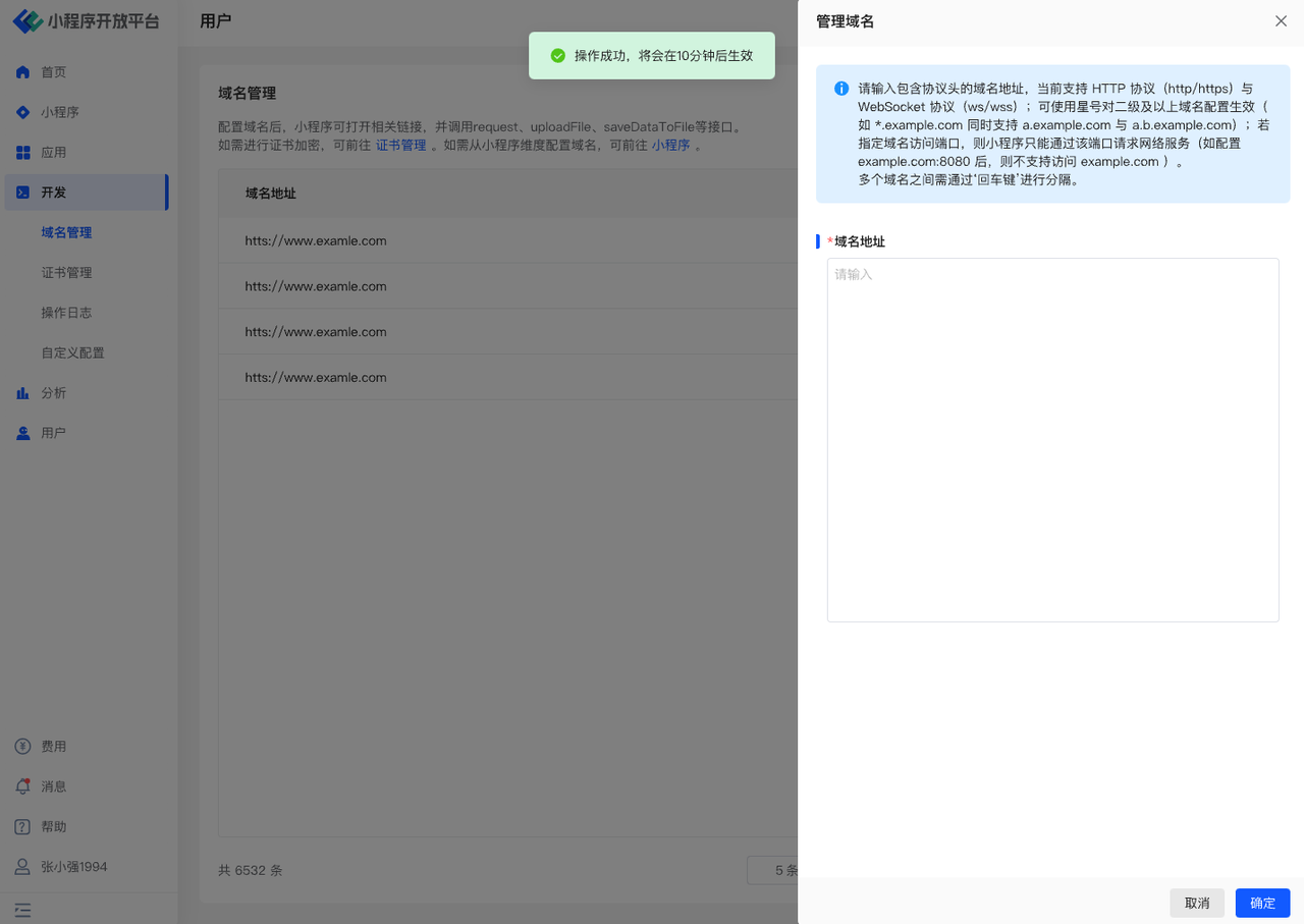 在「开发 - 域名管理」页面中可以管理当前团队所有可使用的小程序域名(即一次配置后所有小程序同时生效),在域名配置处录入当前团队使用的所有域名地址,并使用“回车换行”进行区分后保存即可。