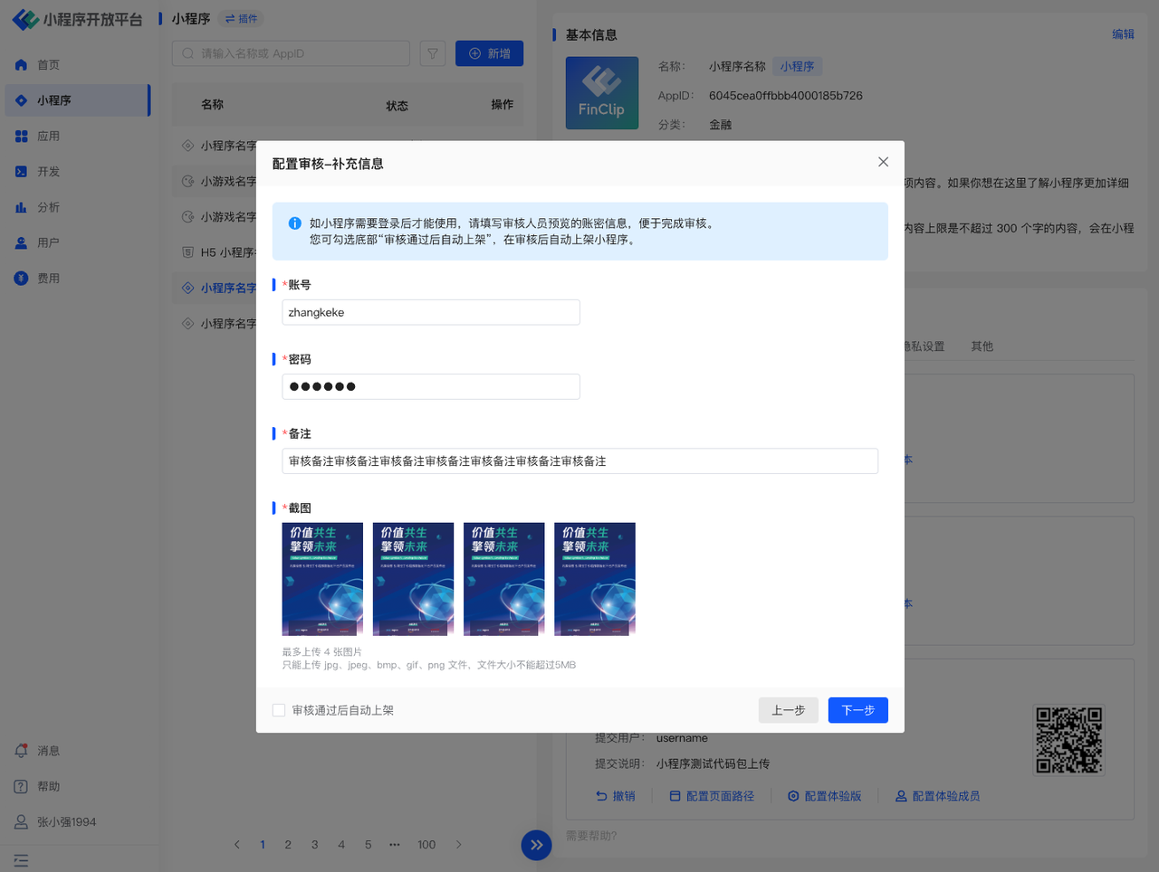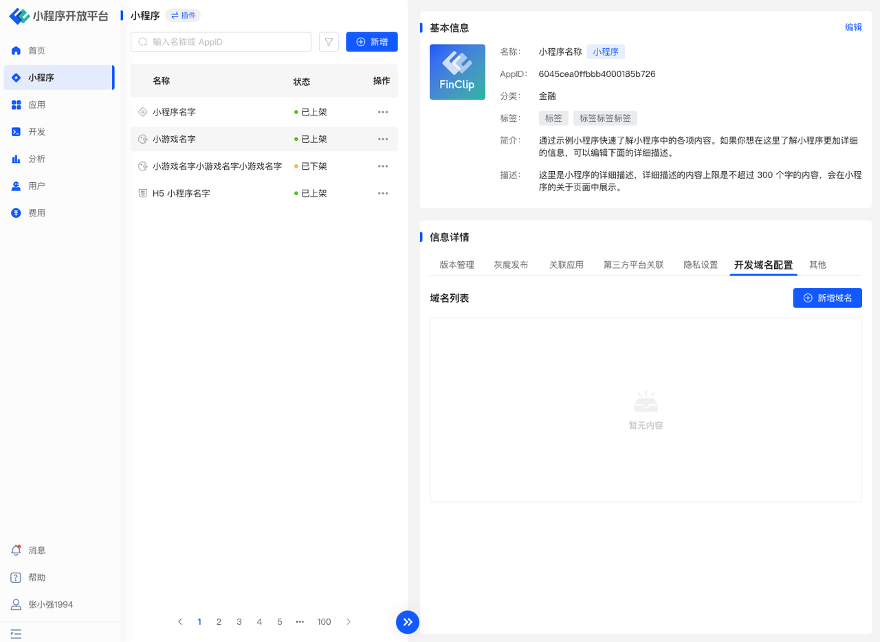 在完成了小程序新建相关工作后,我们需要在 FinClip 小程序开放平台中配置宿主应用的相关信息。只有在配置了宿主应用的相关信息后,小程序才可以在指定的宿主应用中正常运行。