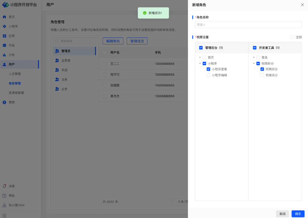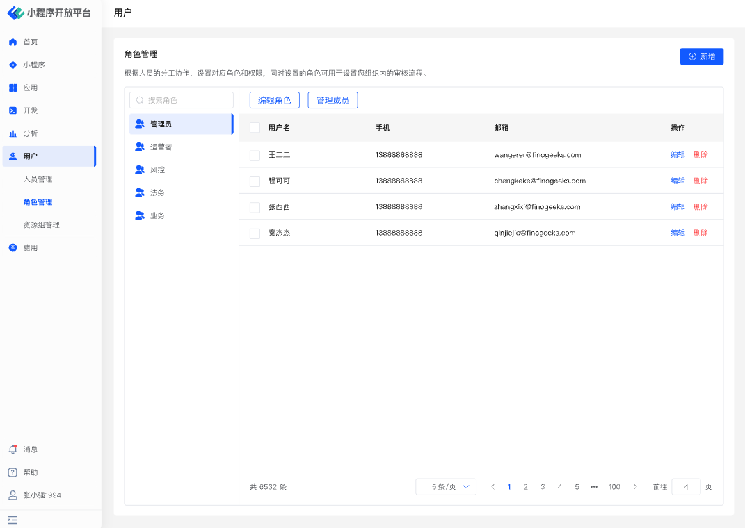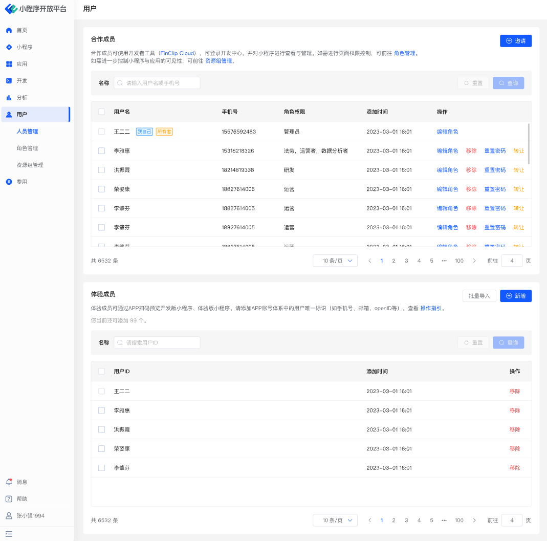 当您登录 FinClip 小程序开放平台管理系统后,可对您当前团队中的成员与角色进行配置。成员管理主要用于配置当前团队中协同开发与运营的人员,角色管理则可以根据人员的分工协作,设置角色,权限与审核流程。