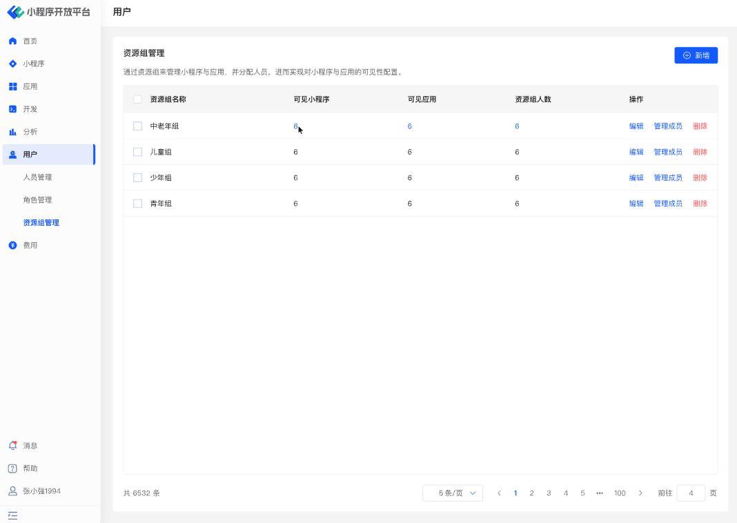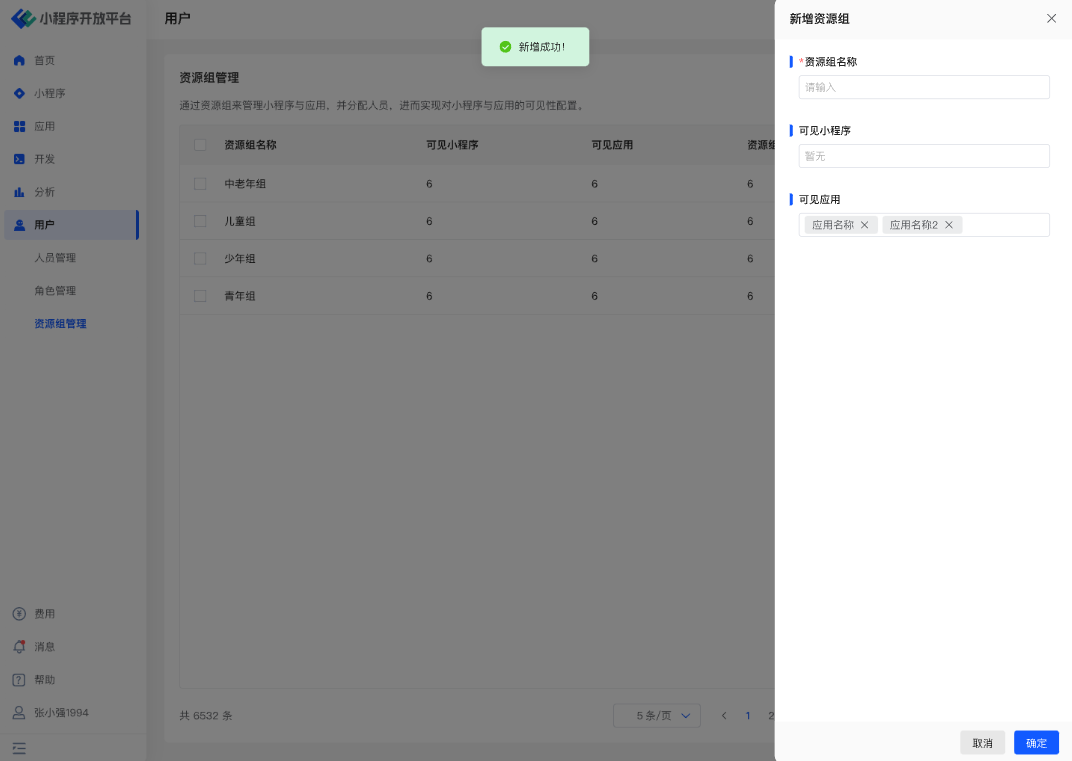 在「资源组管理」页面中录入资源组名称后,分别选择可见小程序与可见应用名称,即可完成资源组的创建。仅在指定资源组的用户才可以看到资源组中的小程序与宿主应用。