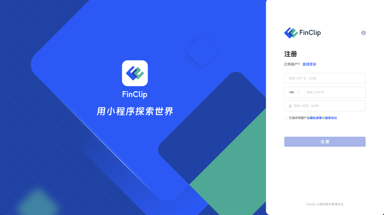 登录 FinClip 小程序开放平台后,点击右上角的「登录/注册」入口,并在其中点击创建账号按钮打开创建账号页面。在新打开的页面中补充用户名,注册手机号与用户密码,并点击完成按钮,即可完成新用户注册操作。