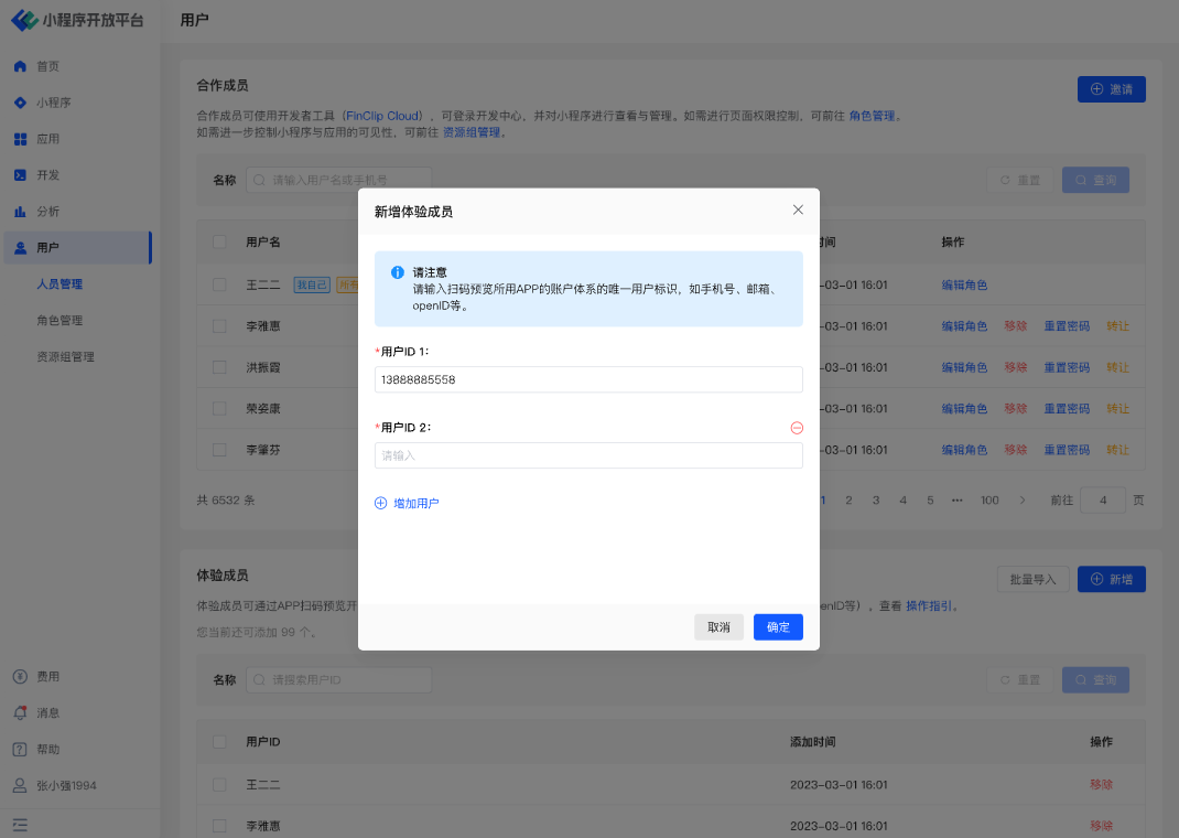 新增体验成员:与合作成员不同,新增体验成员需要录入成员在小程序账户体系中的唯一用户标识(如手机号,邮箱,openID 等)。点击体验成员卡片右上角的「新增」按钮,在弹窗中录入用户的唯一 ID 后点击确定。体验成员配置完毕后,使用指定 ID 使用小程序的用户可以打开体验版的小程序。
