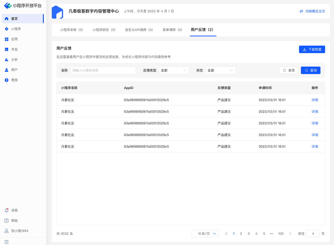 有其他需要您待处理的操作,可以通过首页中的「待办中心」入口进入,其中会包括您需要处理的相关业务流程(如小程序审核,小程序绑定,自定义 API 调用等相关操作),通过待办中心能够快速进入需要处理的业务流程之中,帮助您开展相关的业务。