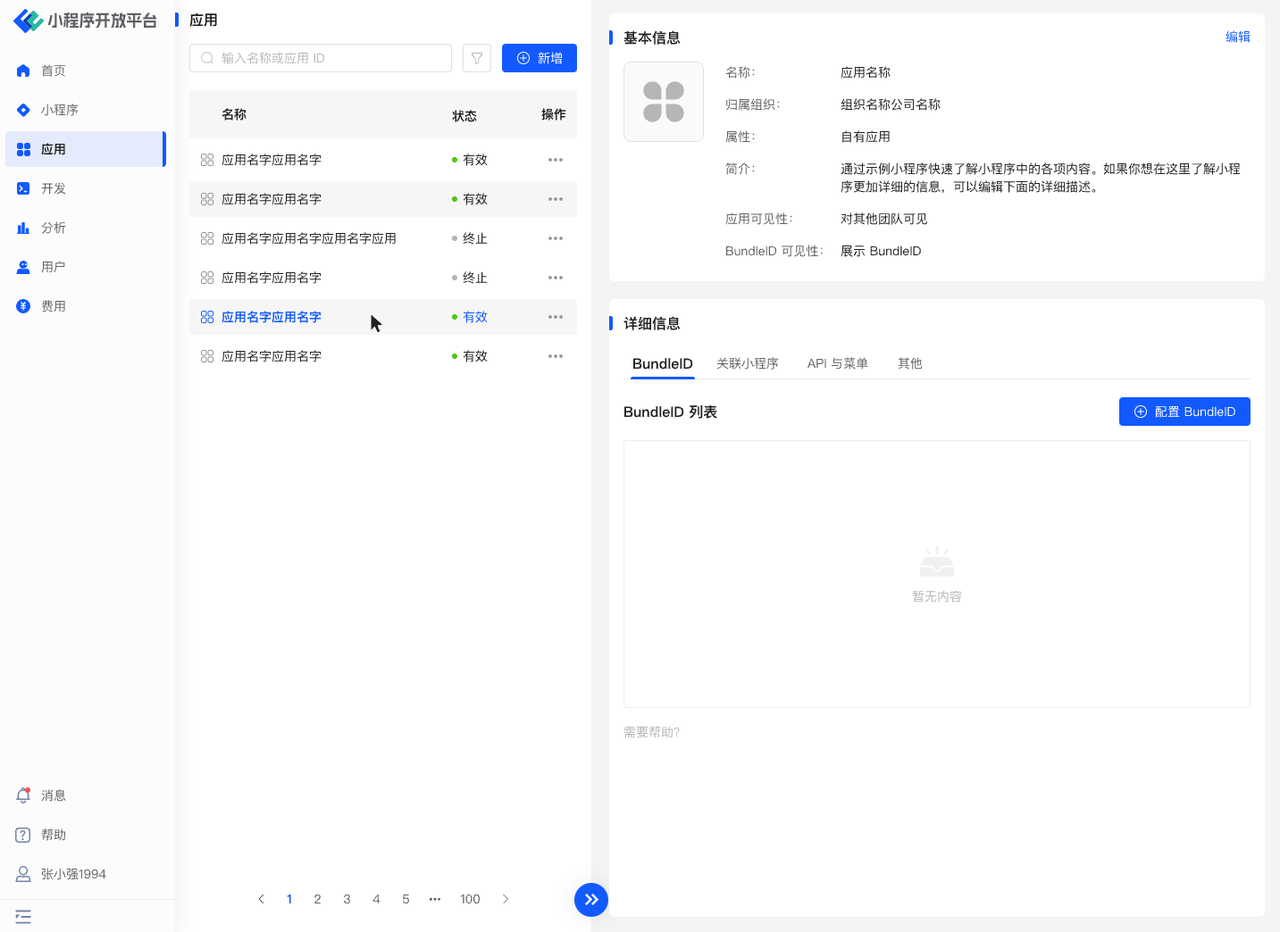 在完成小程序新建后,可以在小程序详情页面对其进行编辑(小程序详情页面中会显示小程序的基本信息以及对应 AppID,其中仅 AppID 不可编辑)。