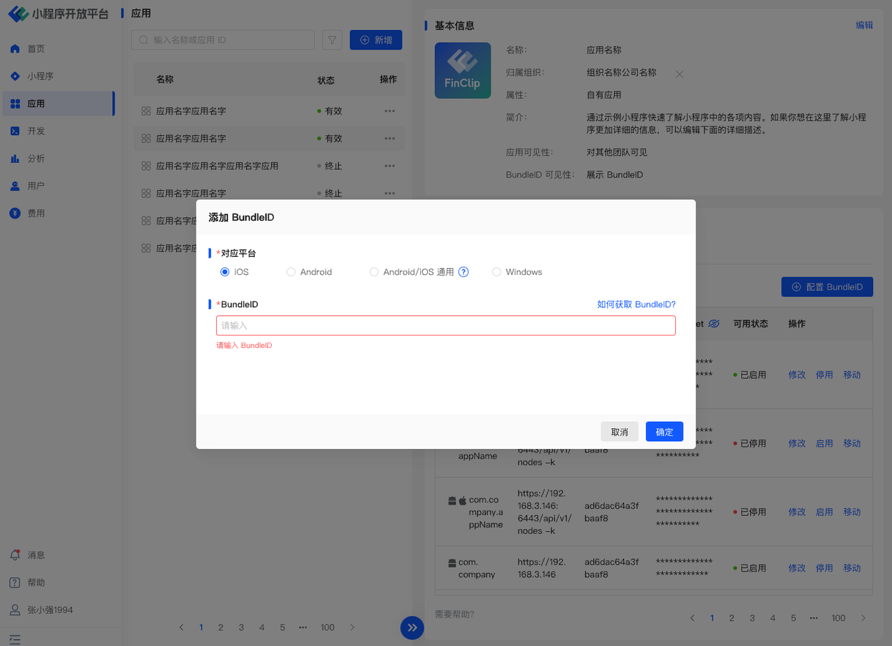 在完成宿主应用的新增后,还需要录入宿主应用的 BundleID 信息以及所属平台。