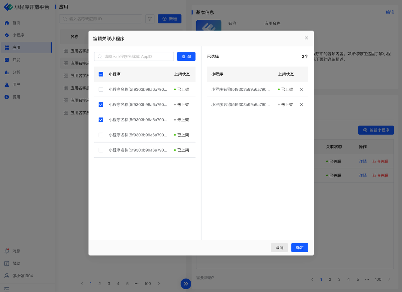 在“应用-关联小程序”页面中,我们可以将可见的小程序与应用进行关联操作。当完成小程序与宿主应用关联操作后,宿主应用还需在自己的 App 中增加小程序的入口,以使用户可进行正常打开小程序。