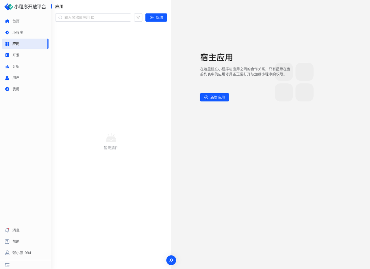 若您是首次登录 FinClip 小程序开放平台,可以分别从首页或小程序页面中点击「新增」按钮开始创建新的宿主应用。