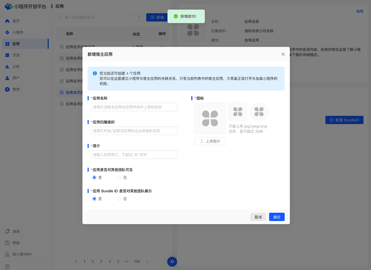 新建宿主应用时,需要分别配置宿主应用的名称,归属组织,简介,图标以及可见性等相关信息。最后两项“是否对其他团队可见”以及“BundleID 是否对其他团队展示”主要用于保护您的应用相关信息,提升小程序与宿主应用的信息保护质量。