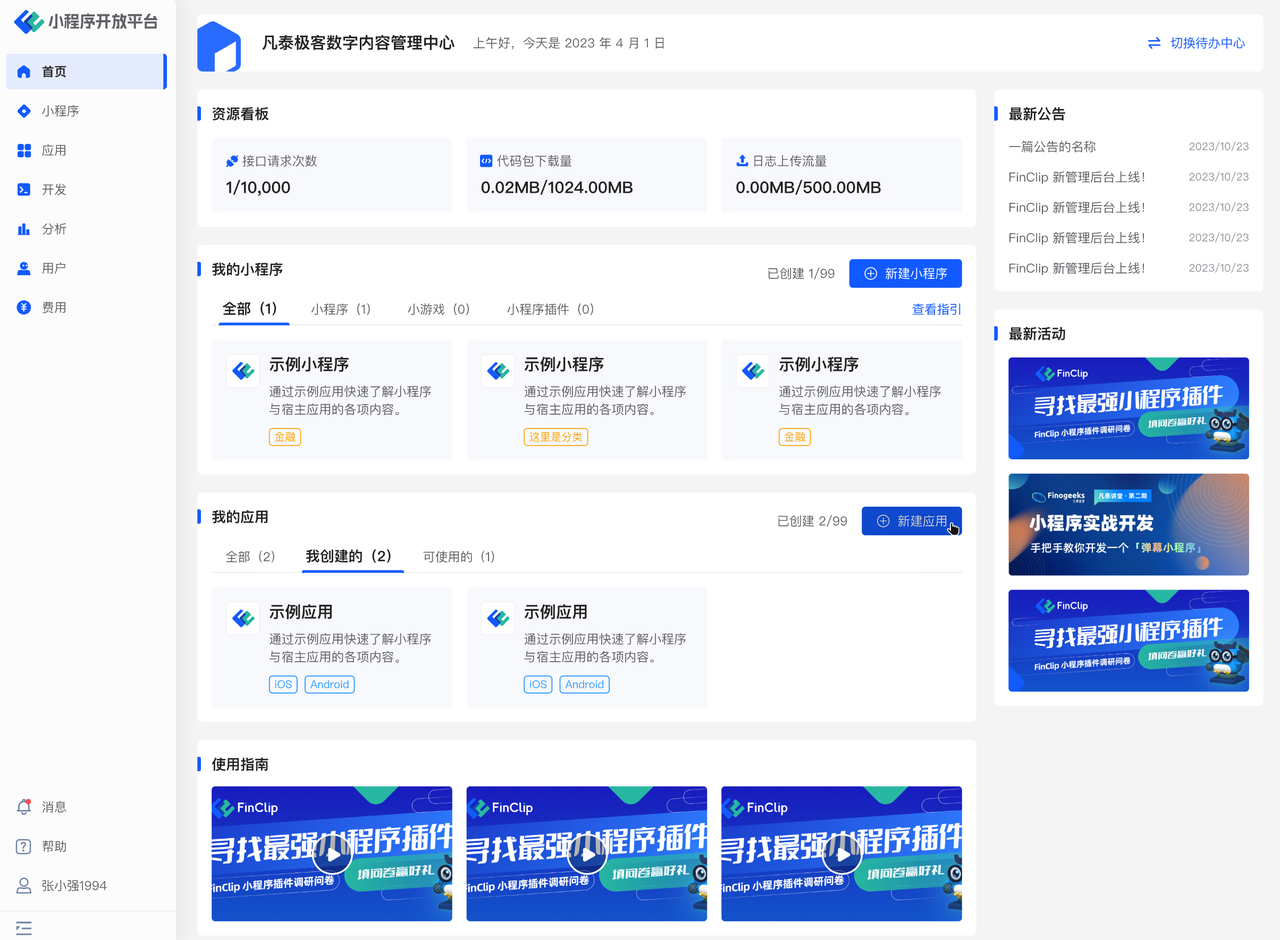 在「待办中心」中,你可以根据当前用户的角色权限看到不同的待处理任务,如下图中的“小程序审核,小程序绑定,自定义 API 调用”等不同菜单。