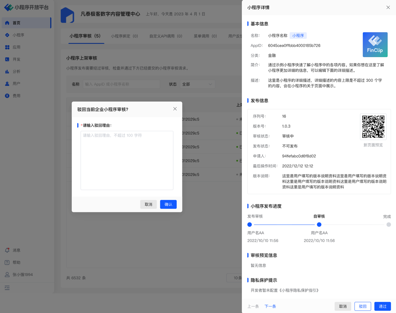 点击弹窗底部的「驳回」或「通过」按钮,即可对当前待处理内容进行操作。
