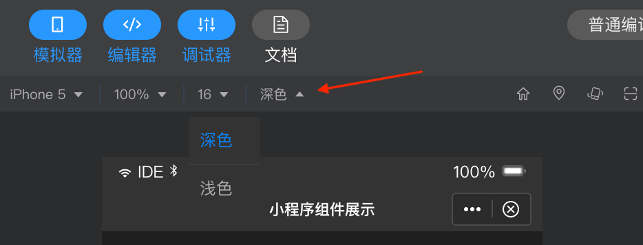开发者工具 1.8.11 版本开始已支持 DarkMode 调试,在模拟器顶部可以切换 深色/浅色 模式进行,如图: