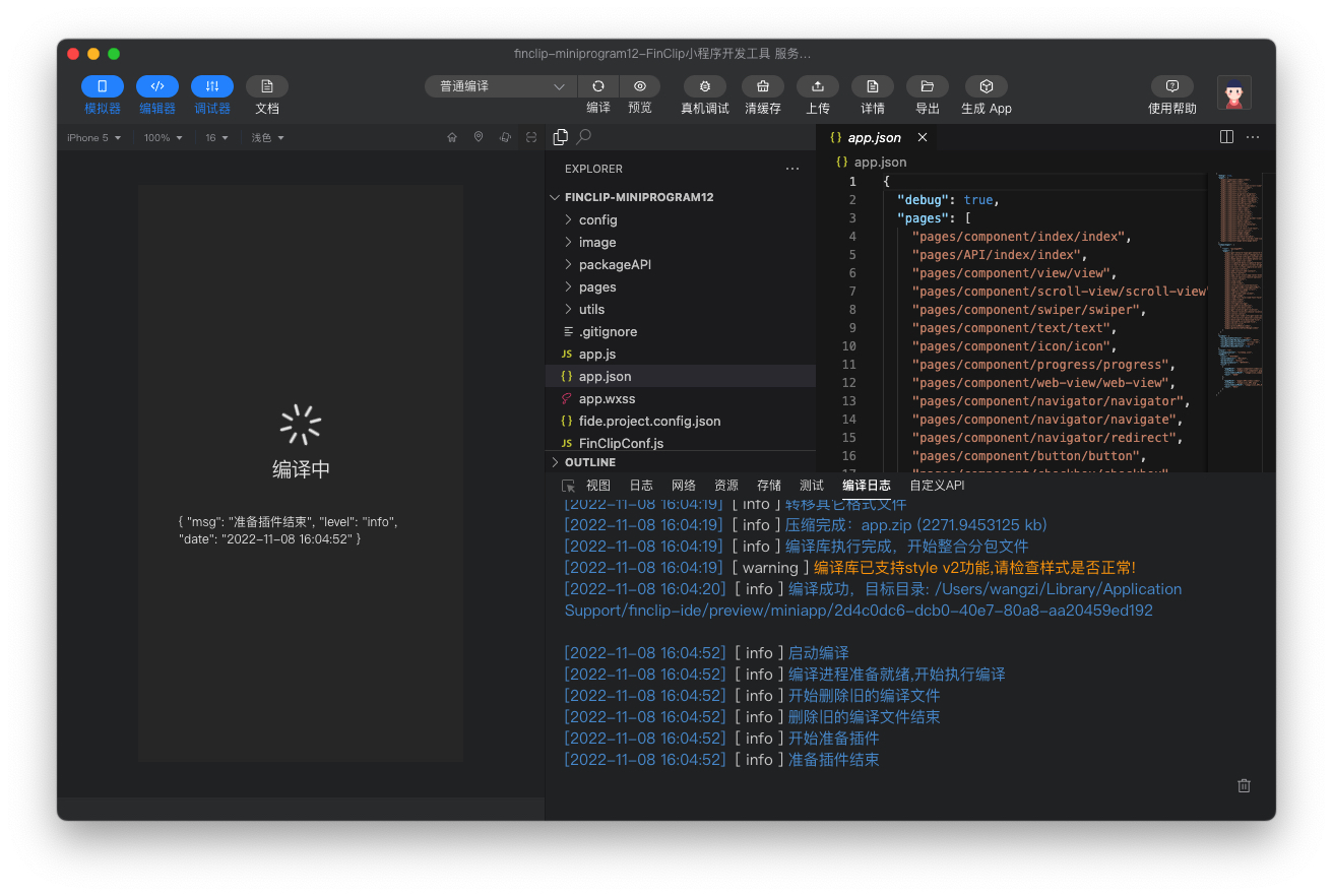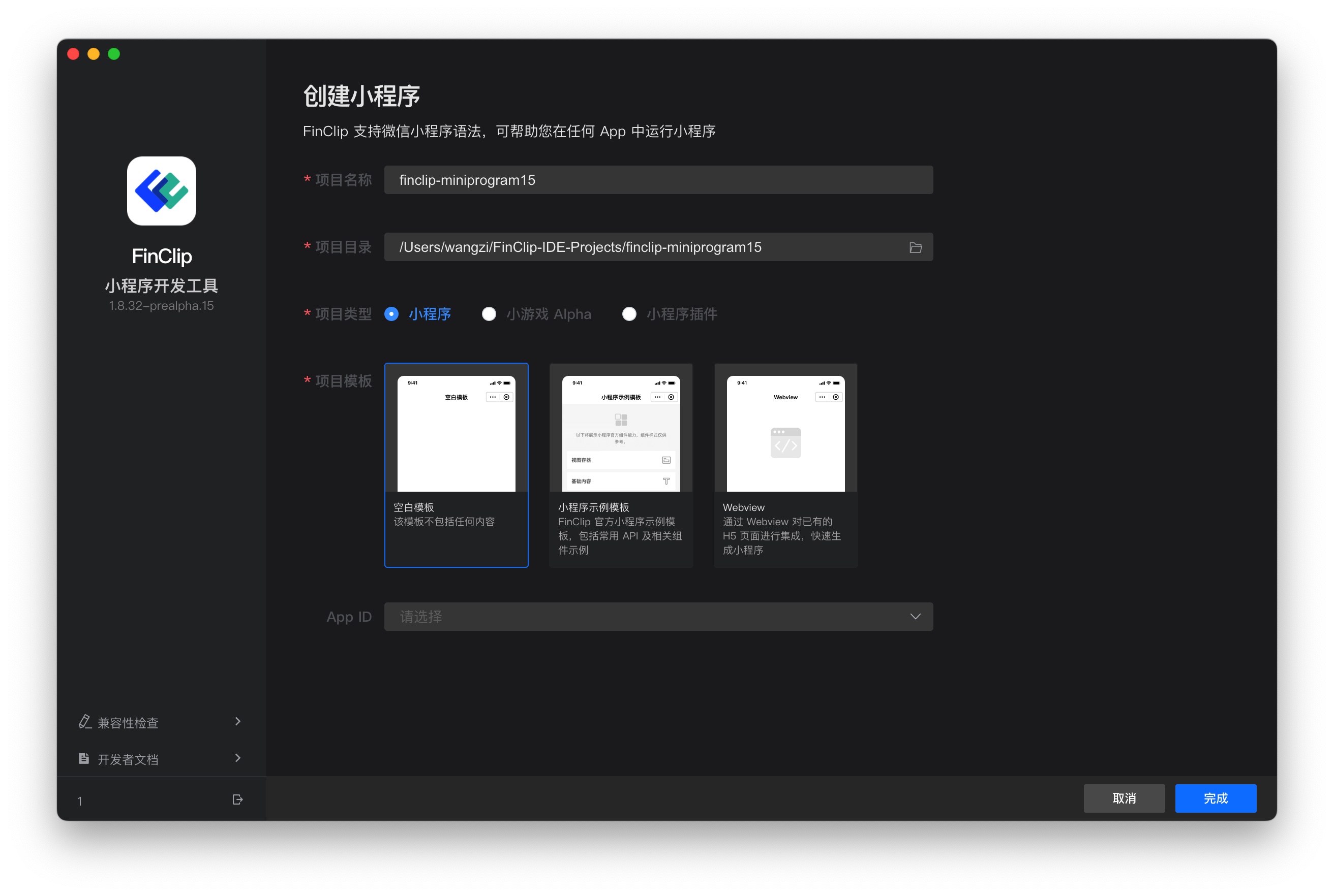 FinClip Studio 提供了对应的操作与模板,用户最终能够生成 App 工程文件(用户可基于工程文件二次开发与配置)。
