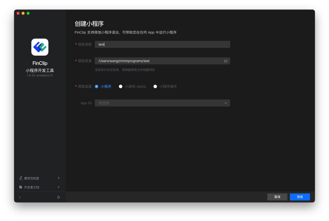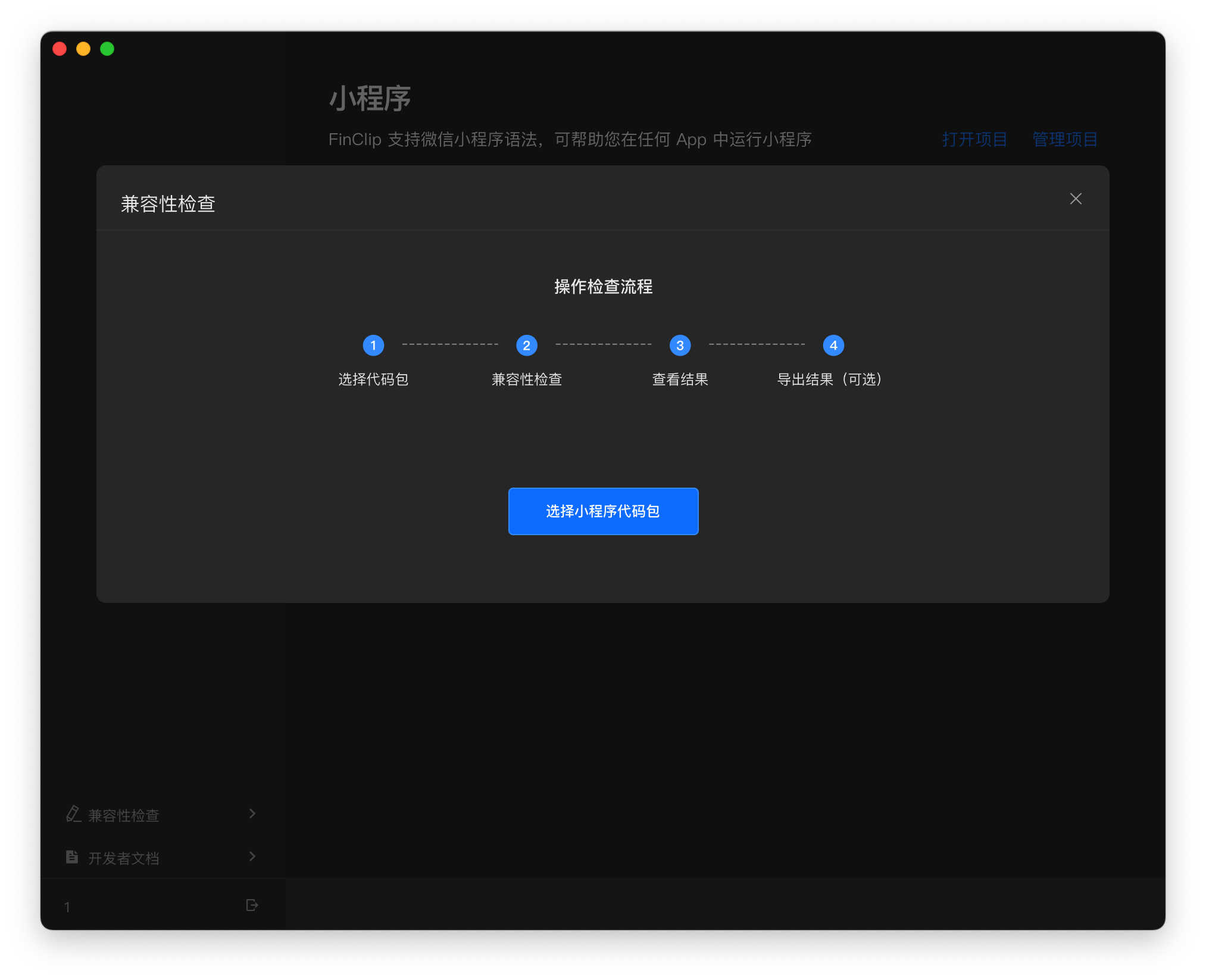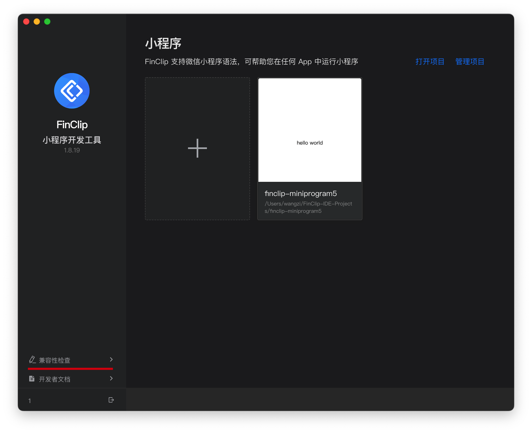 首先打开 FinClip Studio , 点击左下方进入「兼容性检查工具」;
