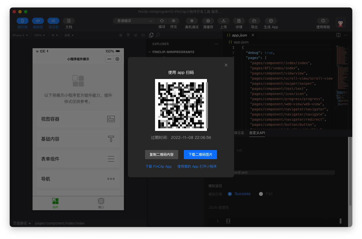 点击顶部工具栏中的「预览」则会展示出可以打开小程序的二维码,您可以在 FinClip App 或自有 App 中,通过扫描二维码的形式打开小程序,进行开发过程中的预览操作。