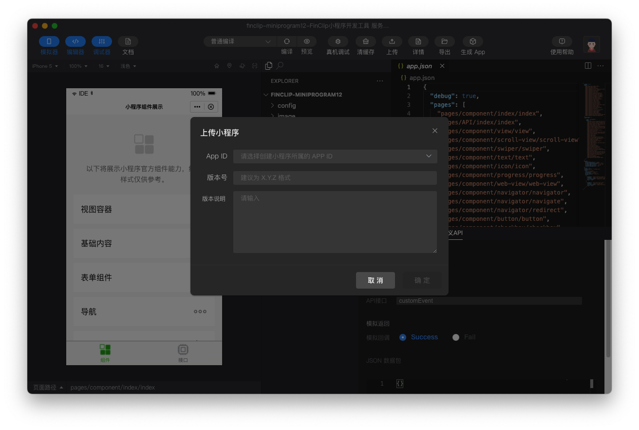登录 FinClip 账户后,点击上方工具栏中的「上传」按钮,选择对应的小程序 App ID 后输入小程序版本好与版本说明信息,可直接将编译好的小程序上传至后台。