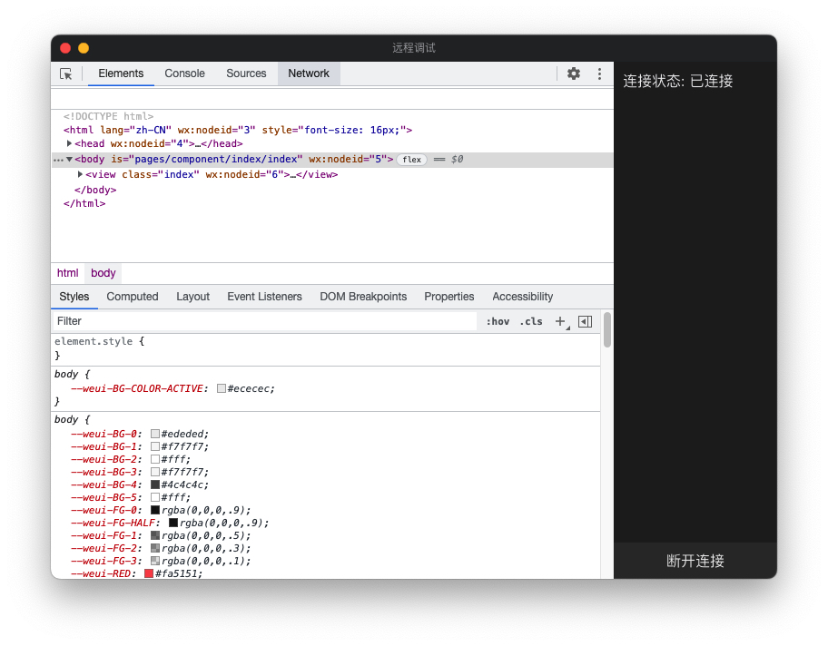 - 远程连接可能会被 VPN / 网络代理影响,如果遇到扫码后,远程调试面板不出现的情况,可以关闭 VPN 或者网络代理后再试。移动设备和电脑本地的代理都可能影响远程调试连接。