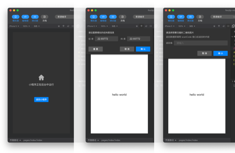 在 FinClip Studio 中模拟器处,您还可以点击上方操作按钮,进行「切后台/模拟定位/摇一摇/扫码」的模拟操作,对小程序中的相关业务逻辑进行模拟测试。