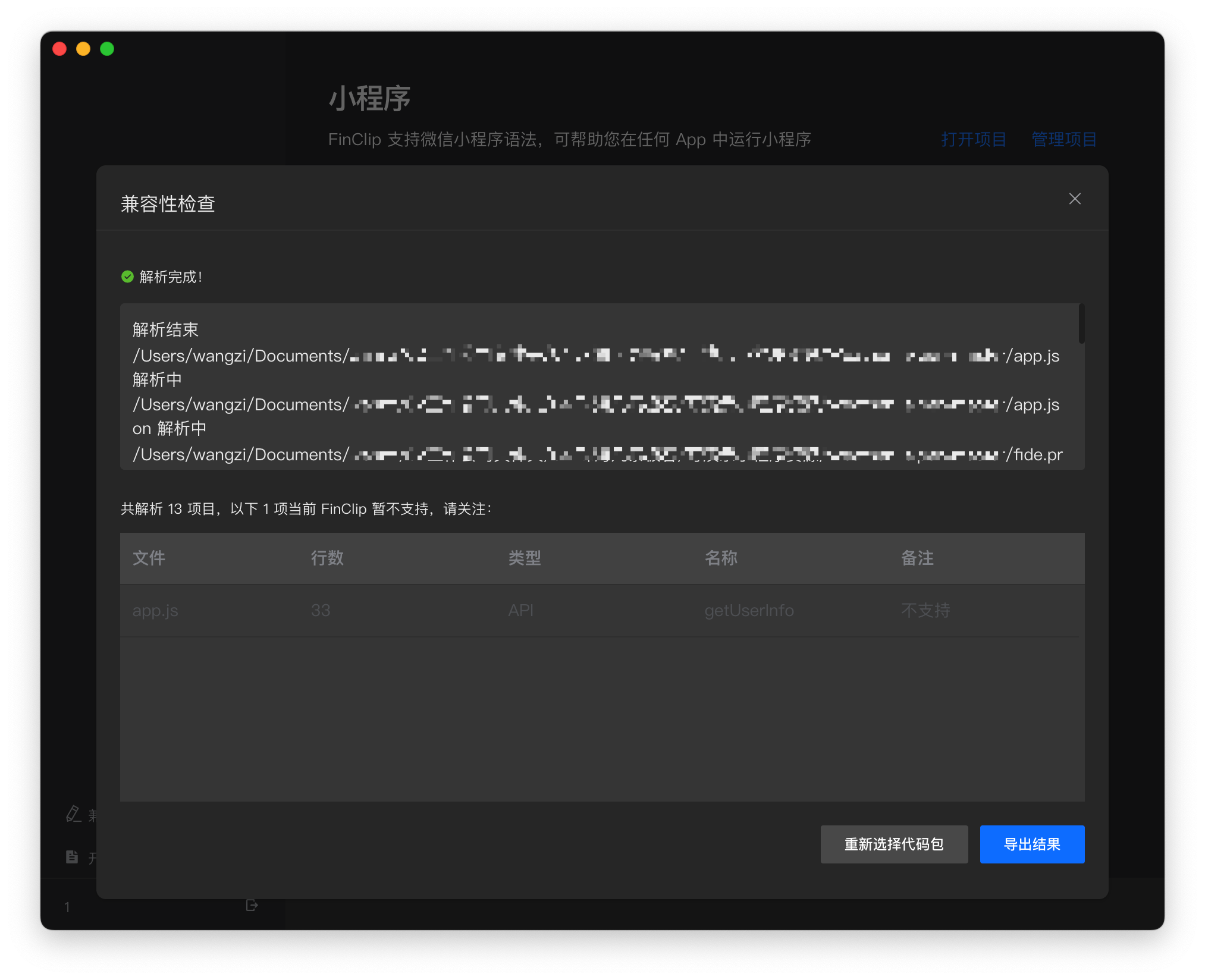 如果您想将已有的微信小程序,迁移到集成了 FinClip 小程序 SDK 的应用中,可以通过兼容性检查定位需要改造的具体事项。