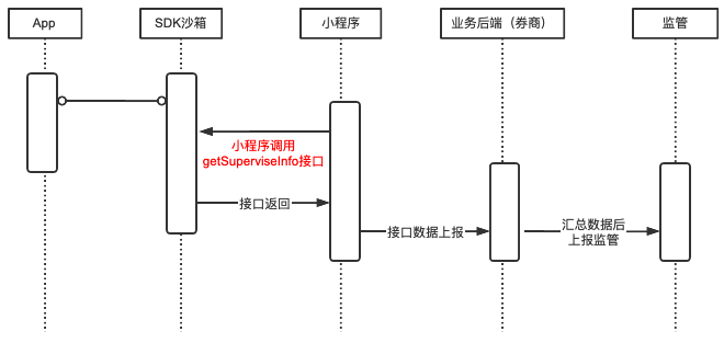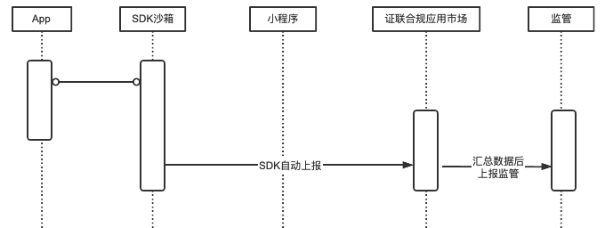 接口,该接口以用户信息和设备信息为主,由小程序主动调用,数据流向为:App→SDK→小程序→小程序业务后端,SDK 不做数据留痕; - 为实现行业合规应用市场留痕要求,SDK 须收集一定业务数据、并向行业合规应用市场进行上报,该类数据不涉及用户敏感信息,以小程序信息和 APP 信息为主,数据流向为:App→SDK→行业合规应用市场;