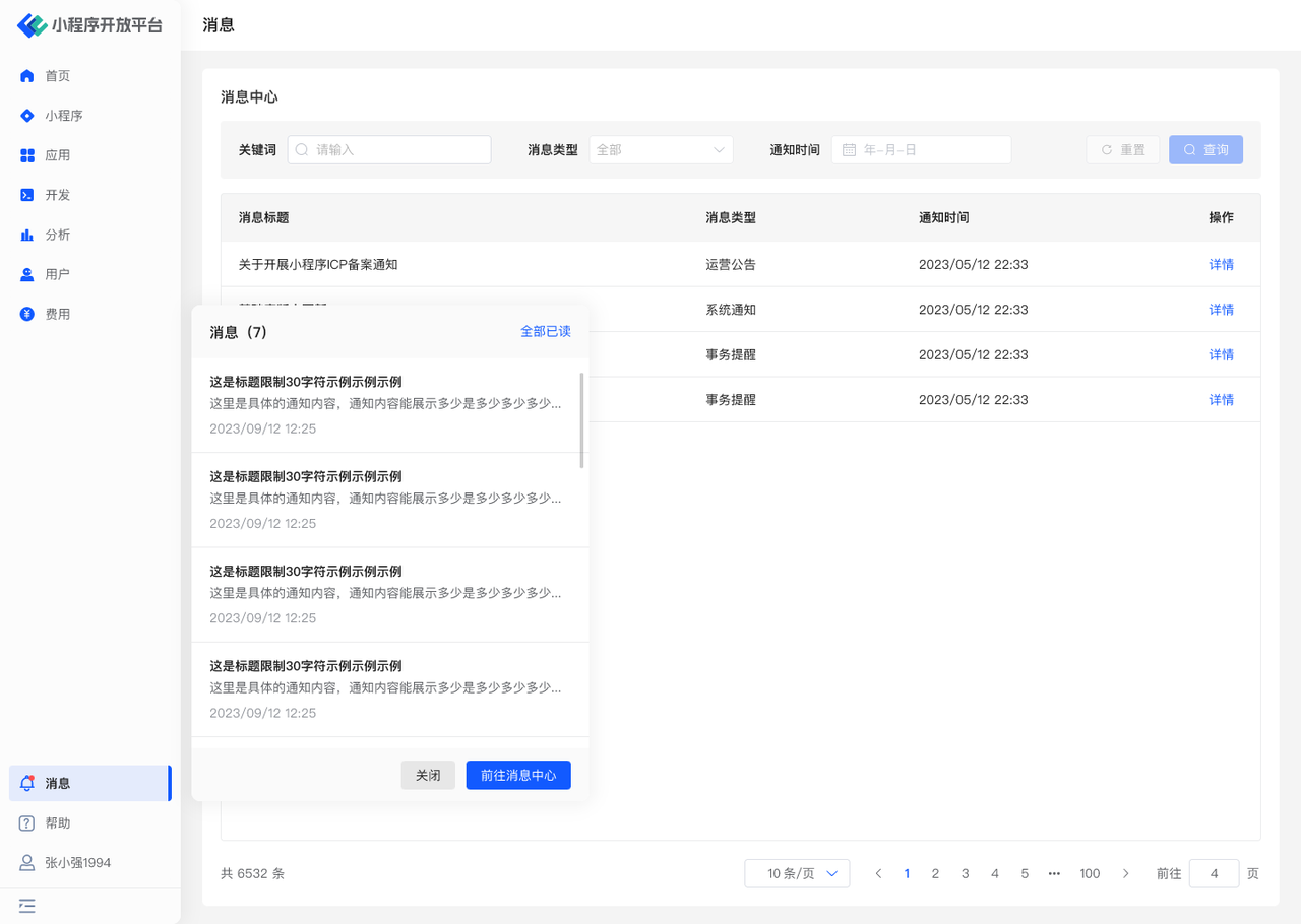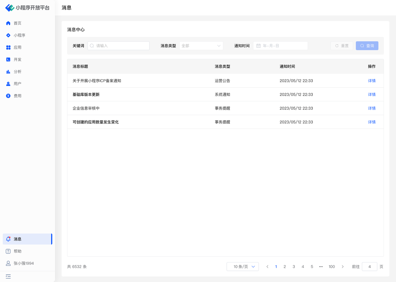 - 通过左下角「消息」菜单进入消息中心,查看所有消息