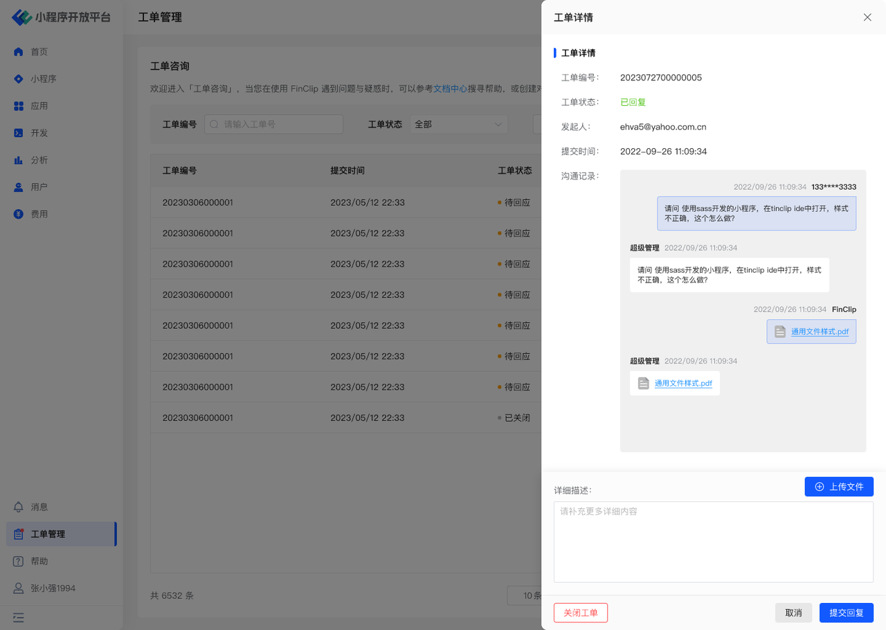 在工单列表页点击查看详情,可查看对应的工单提交信息、回复信息,在对话框内可进行工单的回复或补充,您也可以上传额外的附件资料补充说明。若数字中心的回复已解决您的疑问,可以点击「关闭工单」按钮。
