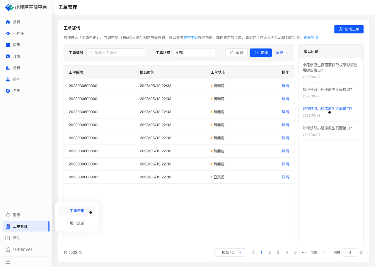 - 查看反馈:查看用户对于小程序的产品建议、功能异常反馈等